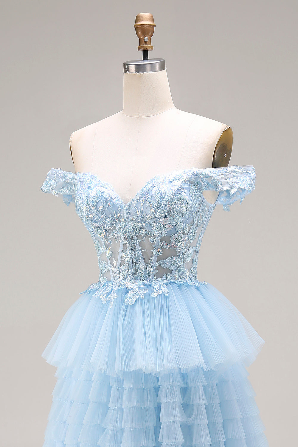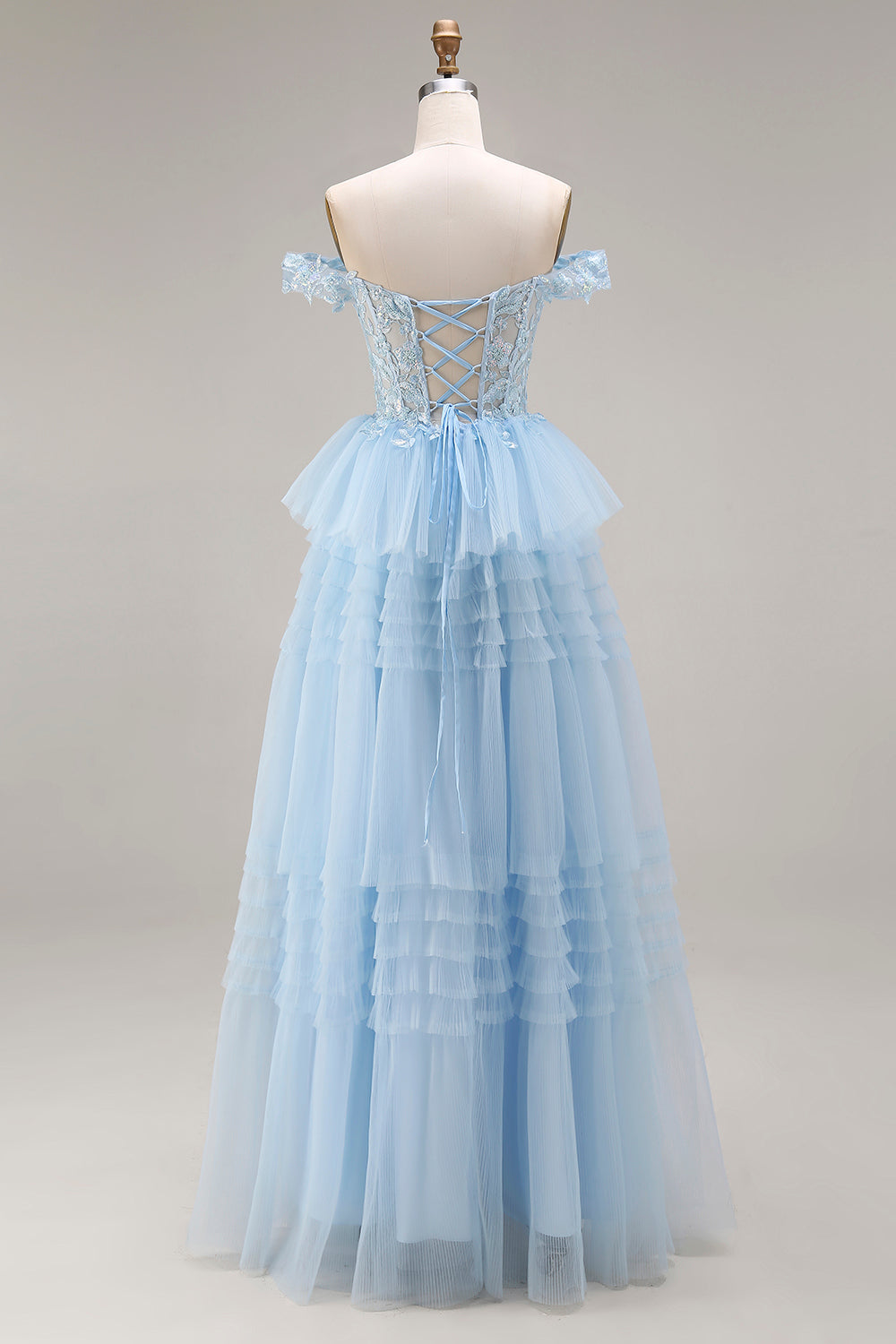 Princess Sky Blue Off The Shoulder Ruffled Long Tulle Prom Dress with Embroidery