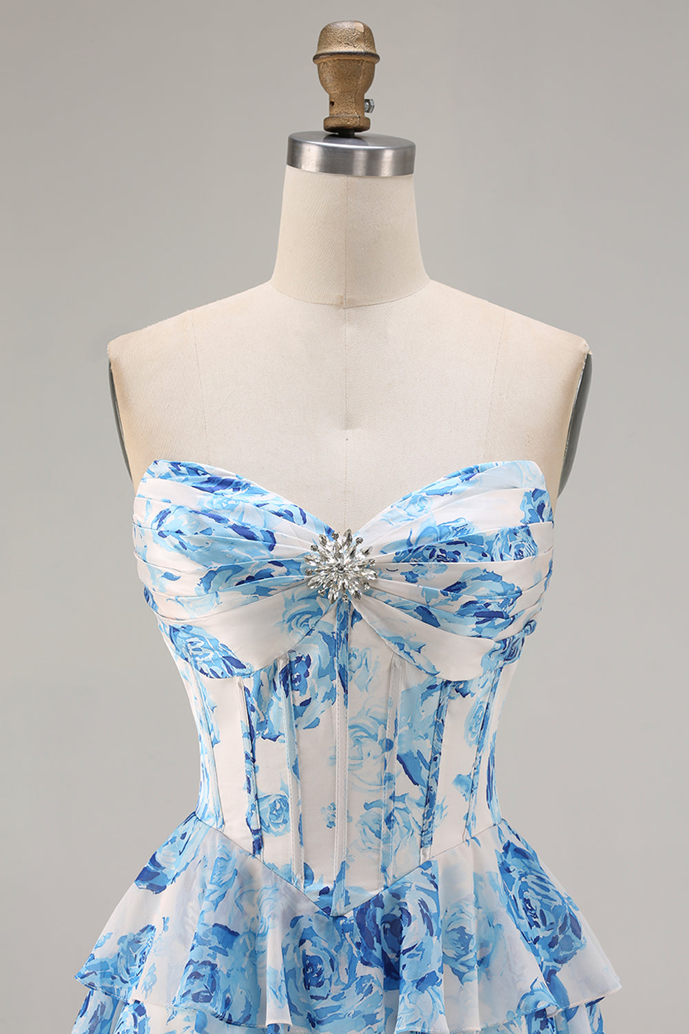 White Blue Floral Strapless A Line Corset Tiered Ruffle Long Prom Dress with Slit