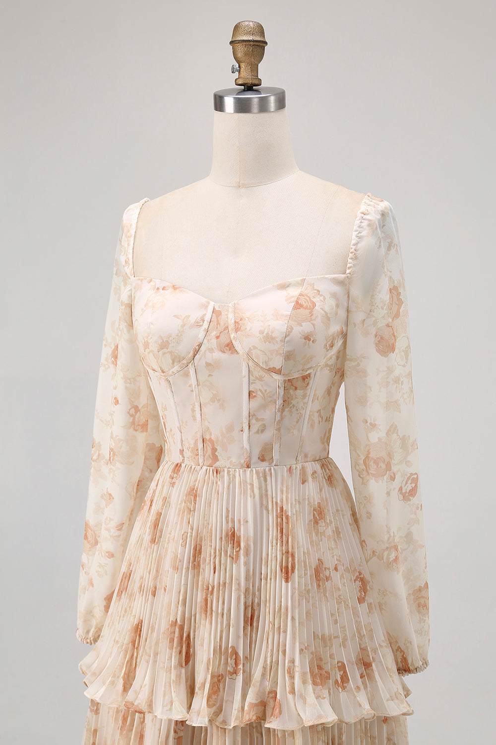 Champagne Floral A Line Tiered Long Sleeve Bridesmaid Dress