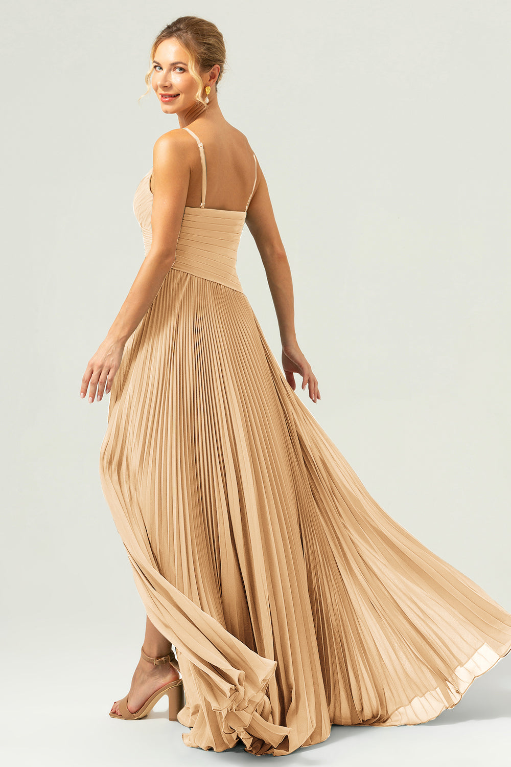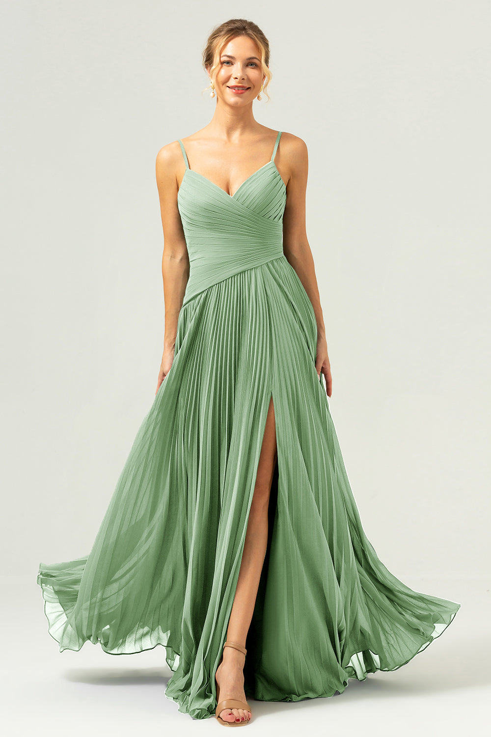 A-Line Spaghetti Straps Pleated Chiffon Eucalyptus Bridesmaid Dress with Slit