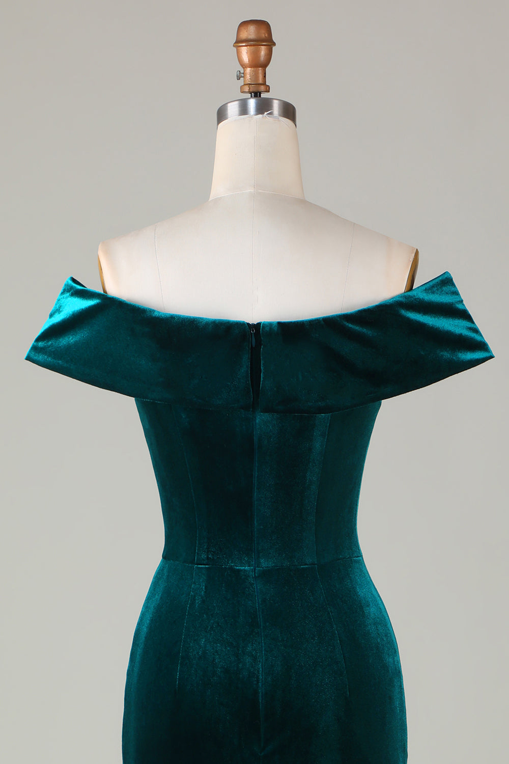 Off the Shoulder Peacock Green Velvet Mermaid Bridesmaid Dress With Slit