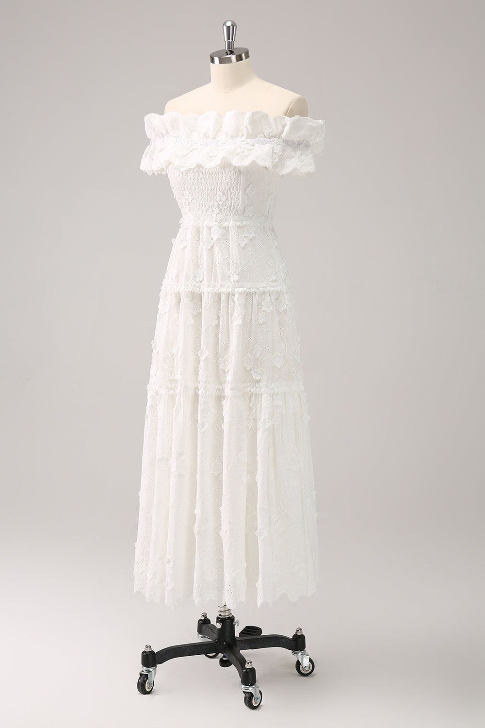 Cute A Line White Off the Shoulder Tea Length Bridesmaid Dress with Ruffles
