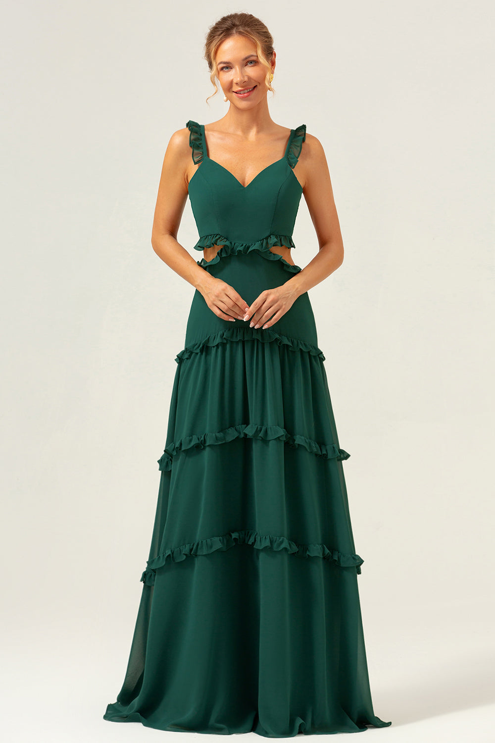 Dark Green A Line Chiffon Ruffled Long Bridesmaid Dress with Hollow Out