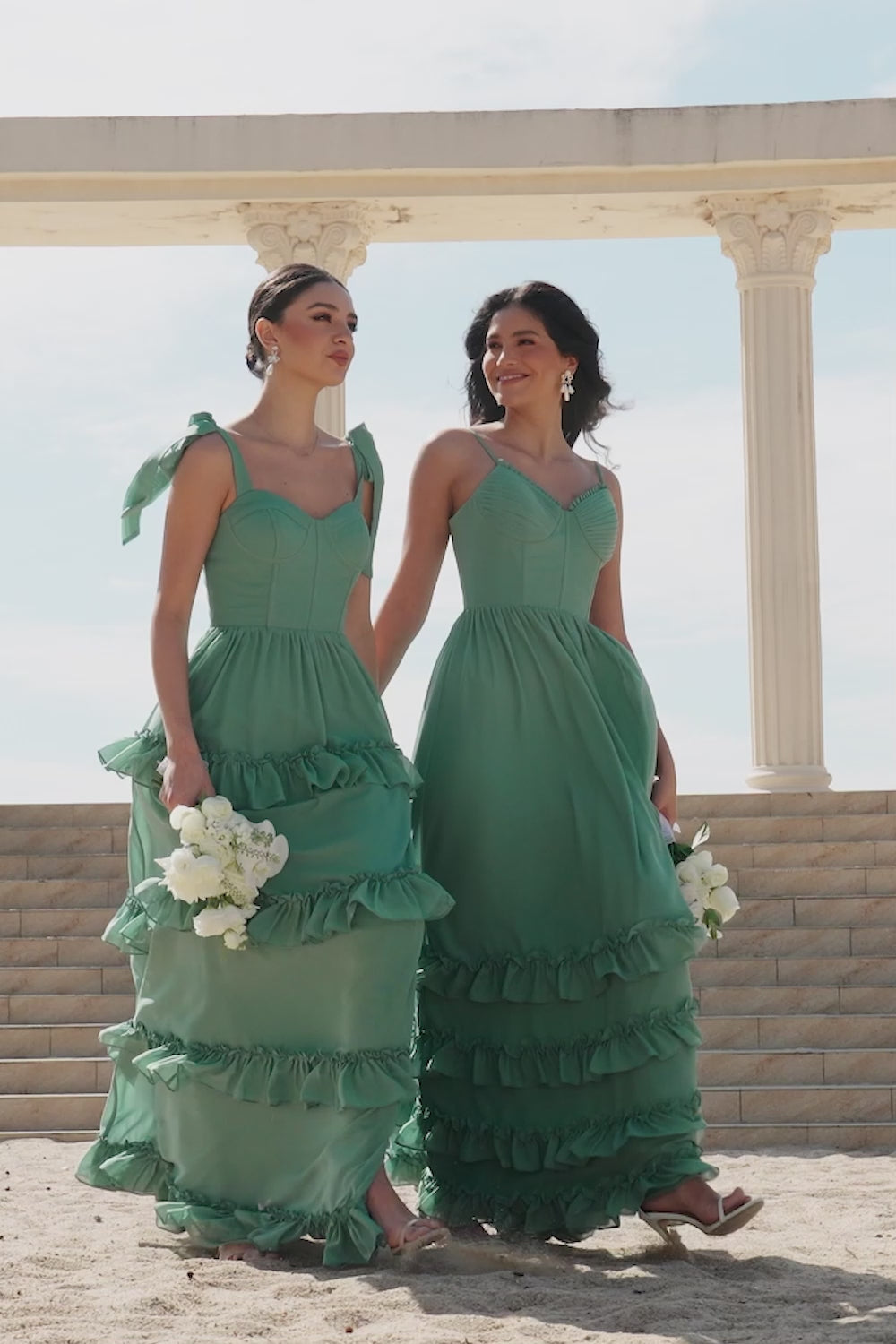 Eucalyptus A-Line Bow Tie Straps Corset Ruffles Chiffon Long Bridesmaid Dress with Slit
