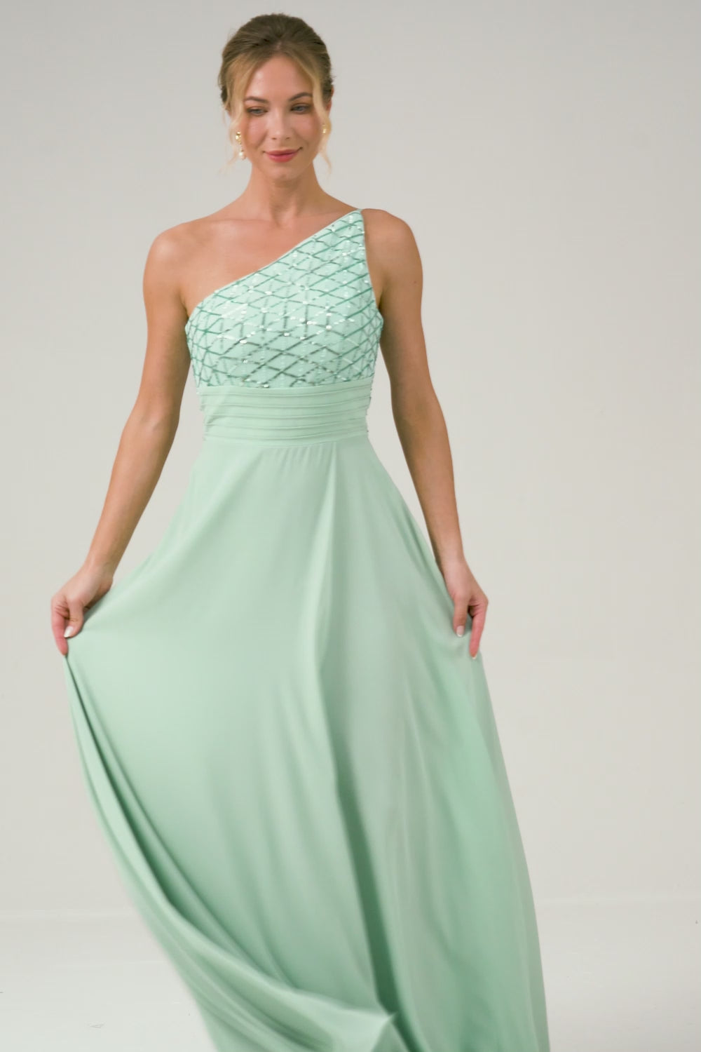 Sparkly Green A-Line One Shoulder Chiffon Long Bridesmaid Dress