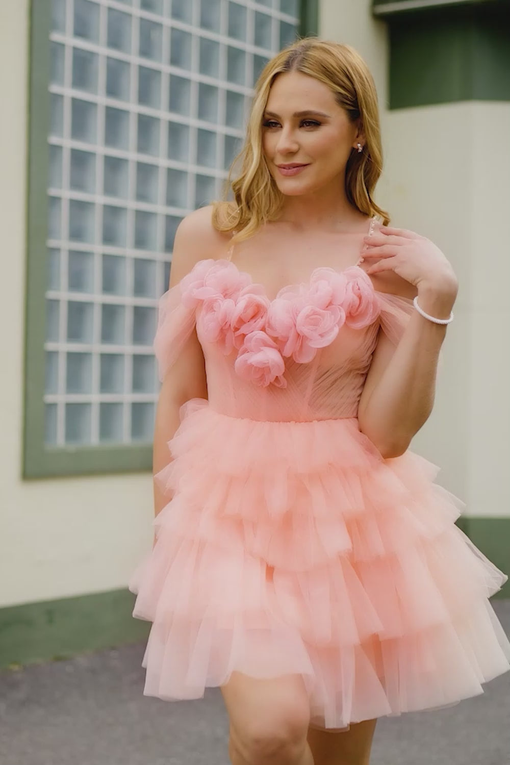 Blush A Line Cold Shoulder Tiered Short Graduation Dress with 3D Flowers