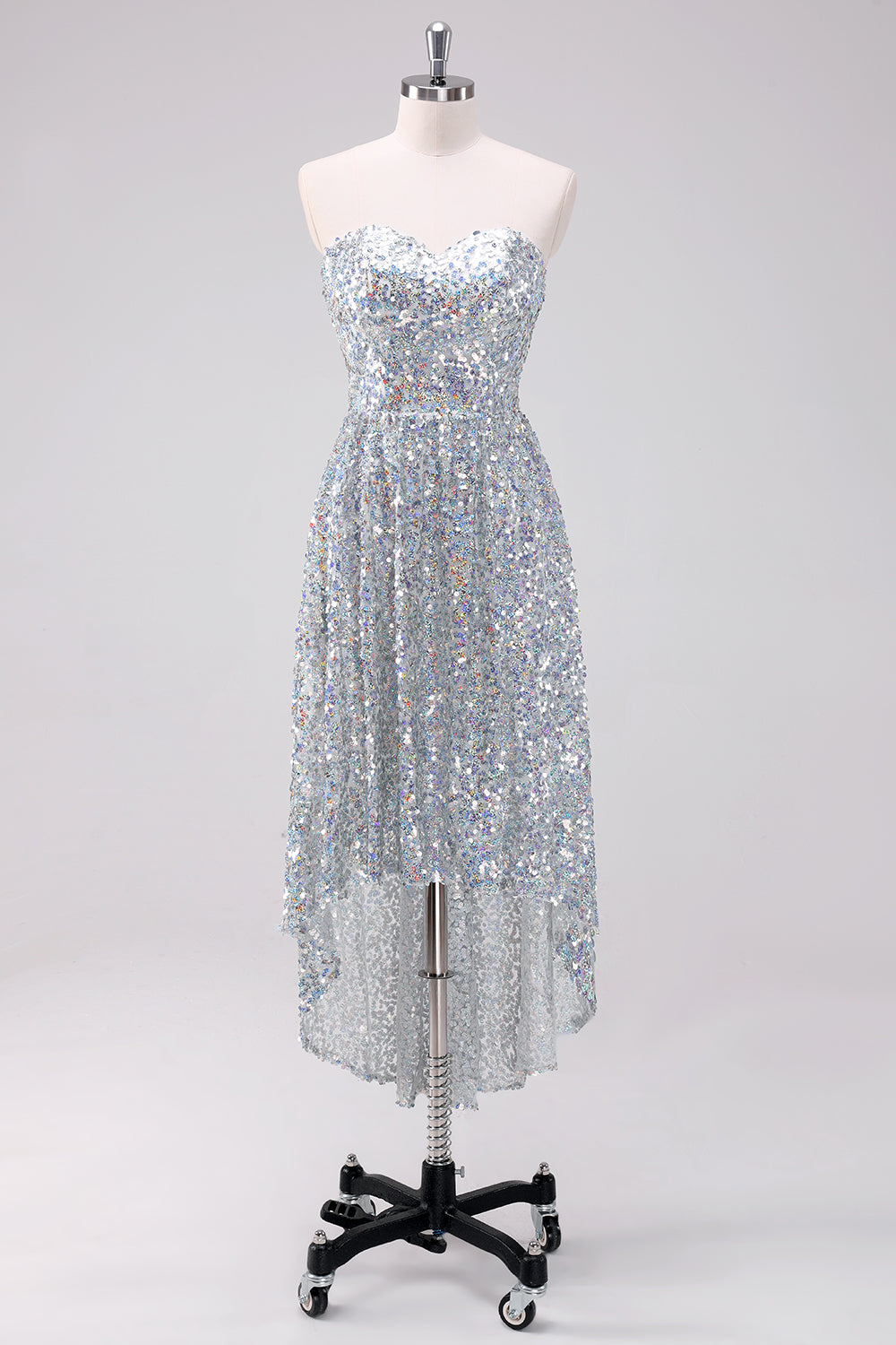 Sparkly Silver Sweetheart Asymmetric Graduation Dress with Sequins