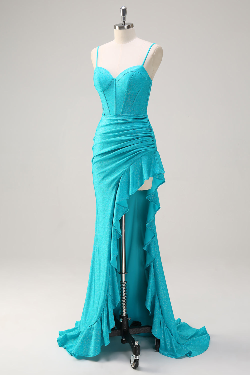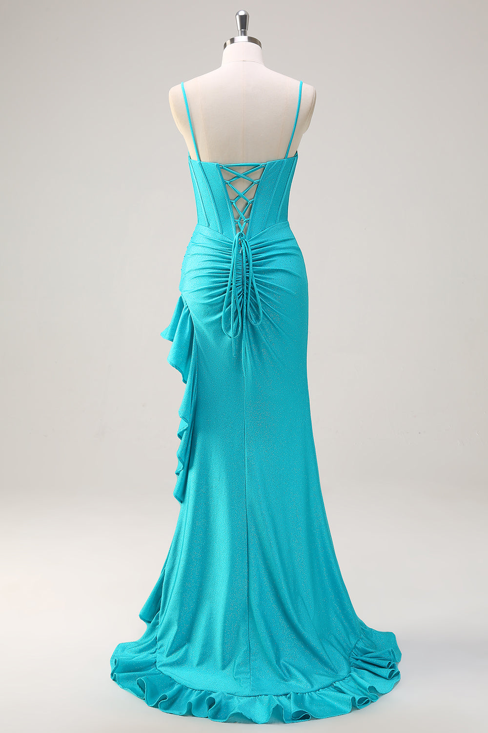 Blue Spaghetti Straps Mermaid Beaded Long Corset Prom Dress with Ruffle Slit