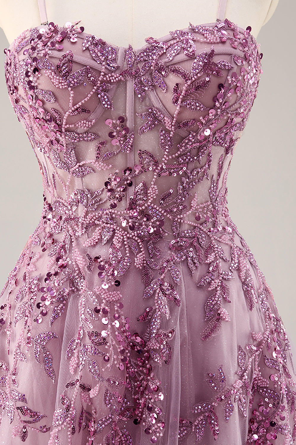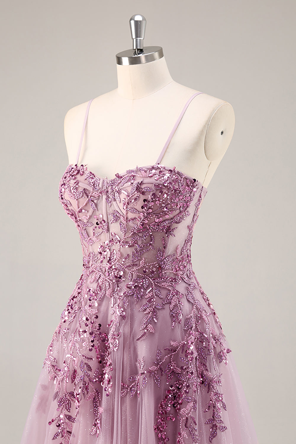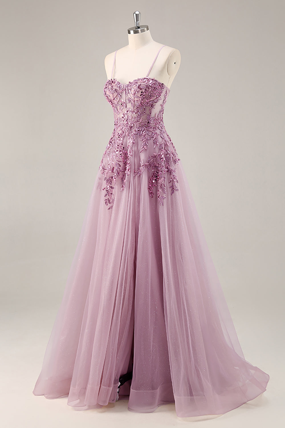 Grey Purple Beaded Corset Applique Long Prom Dress with Slit