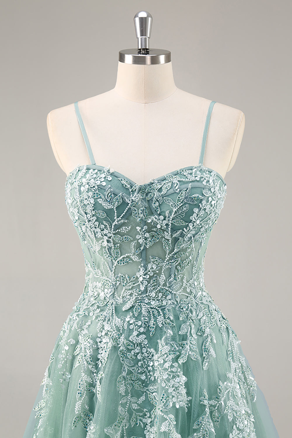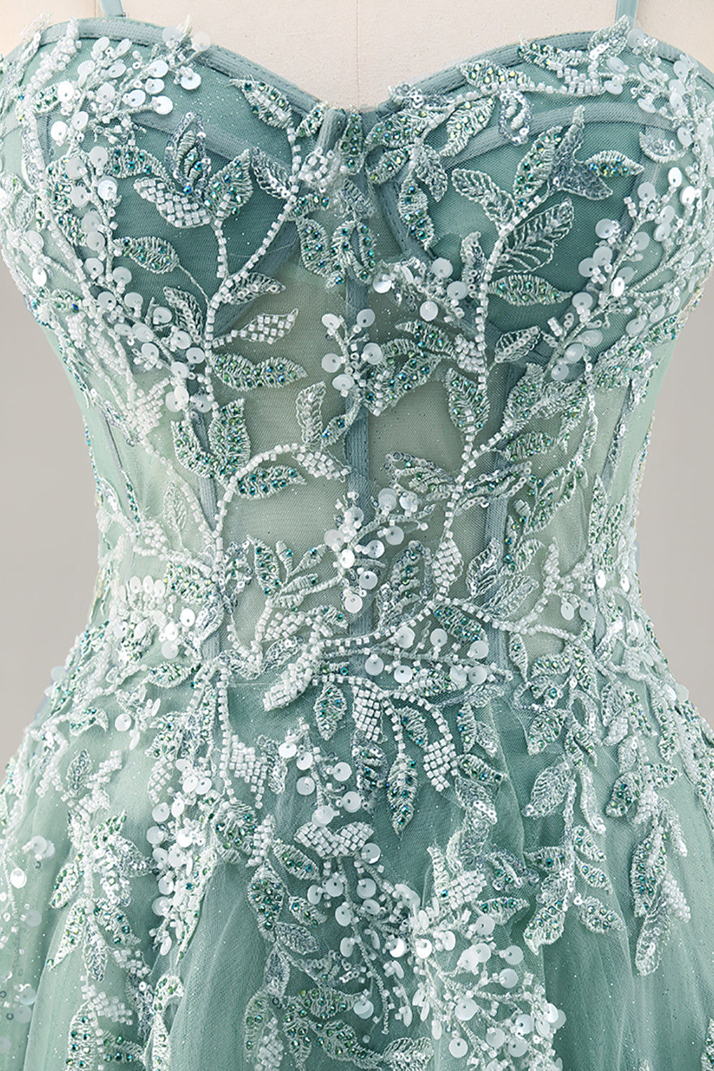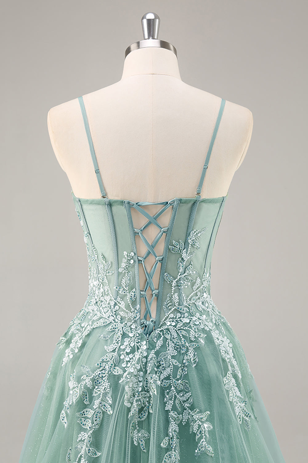 Grey Purple Beaded Corset Applique Long Prom Dress with Slit