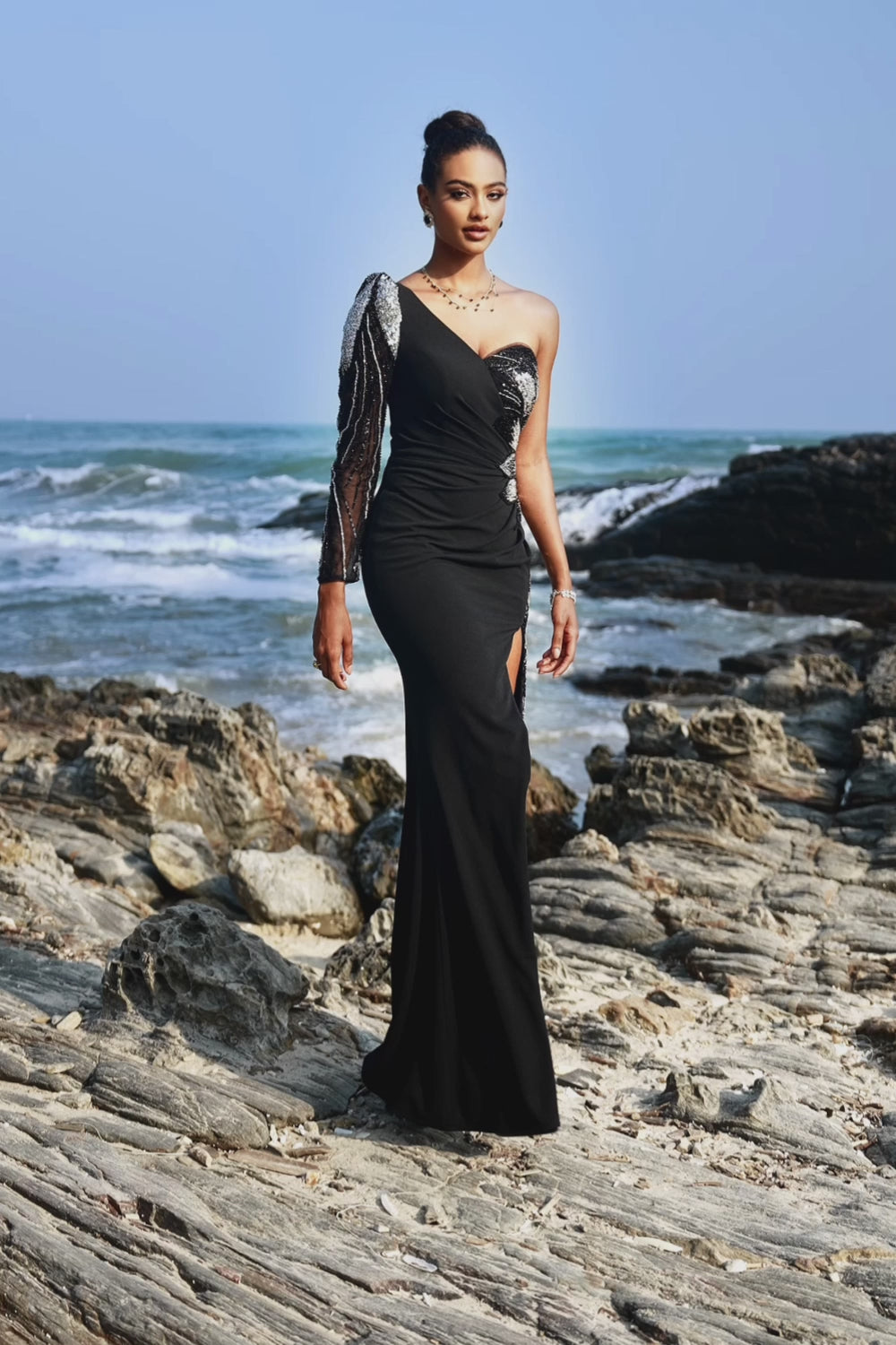 Black Sequin Mermaid One-Shoulder Evening Dress with Slit