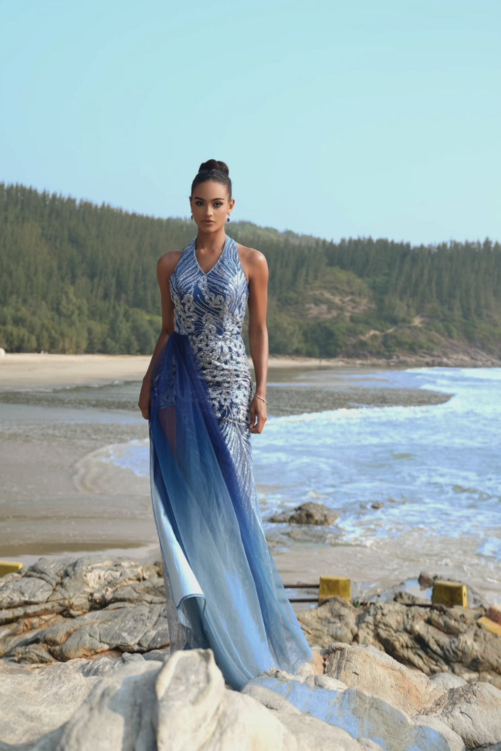 Blue Mermaid Sequin Halter Evening Dress with Slit
