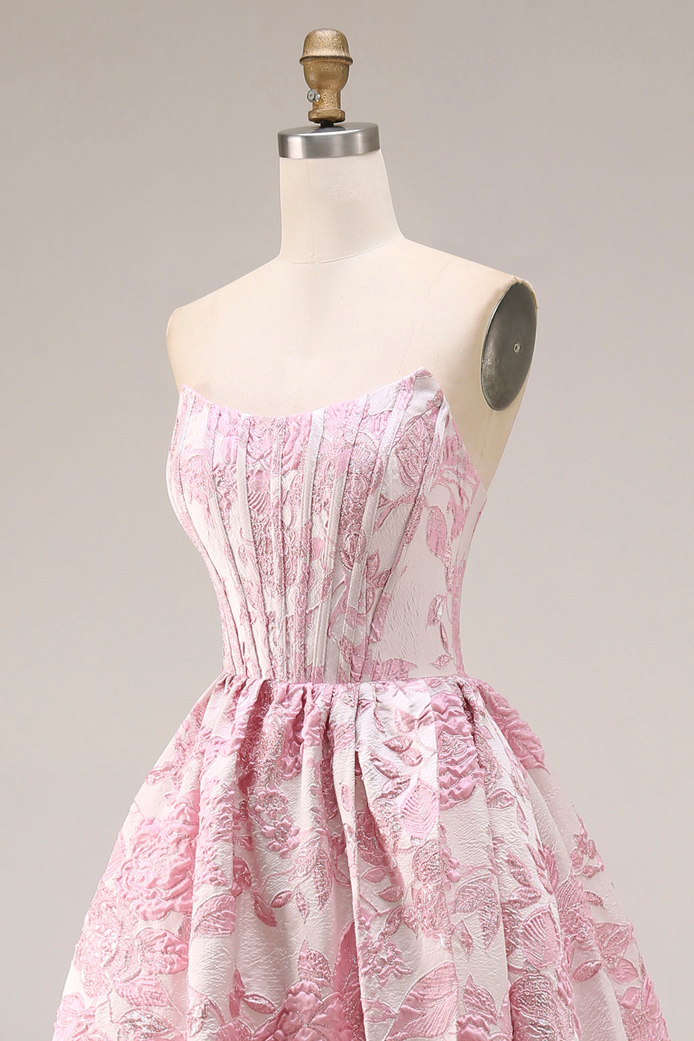 Pink Floral Strapless Corset Jacquard Brocade A-Line Long Prom Dress with Slit