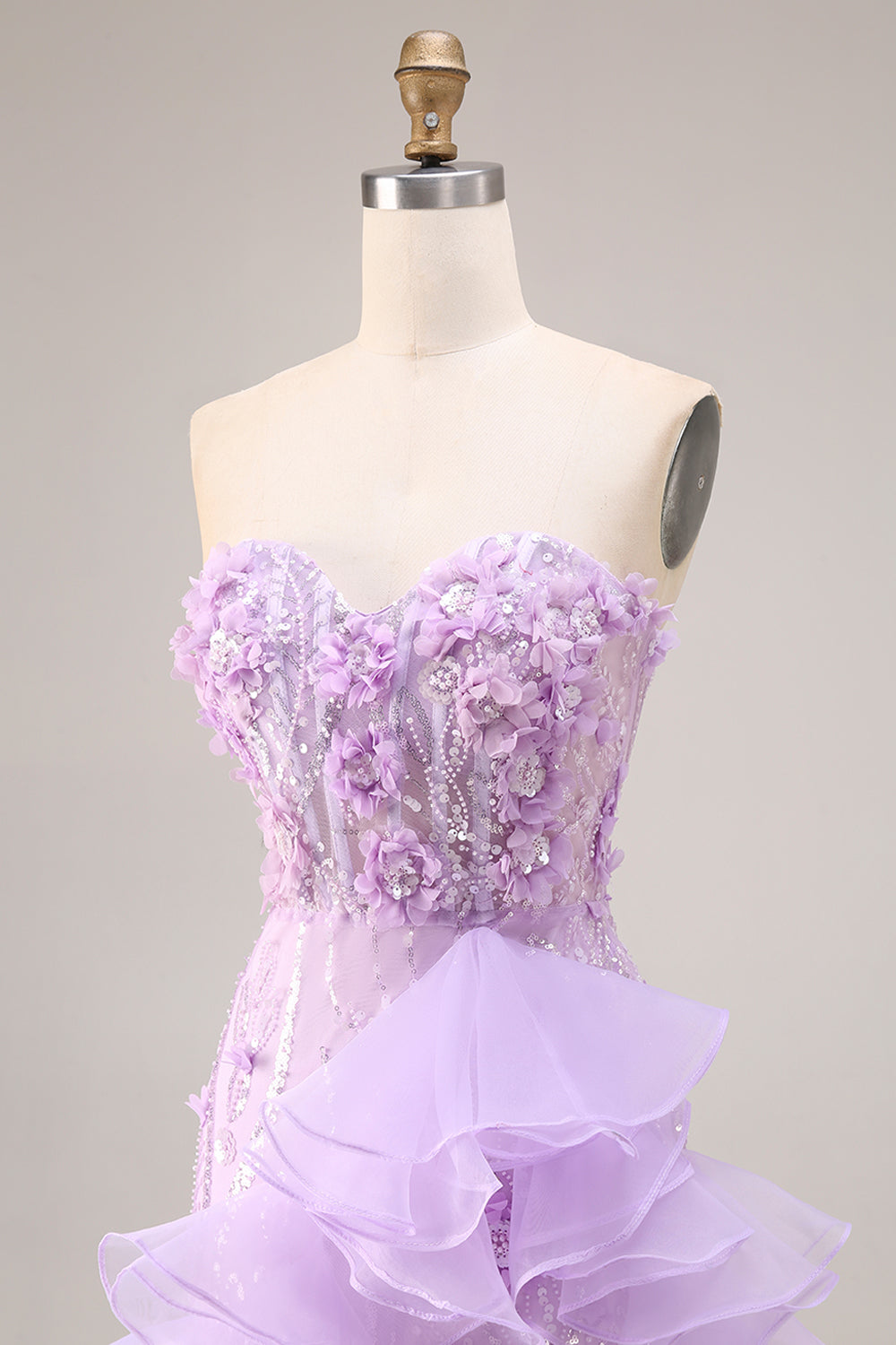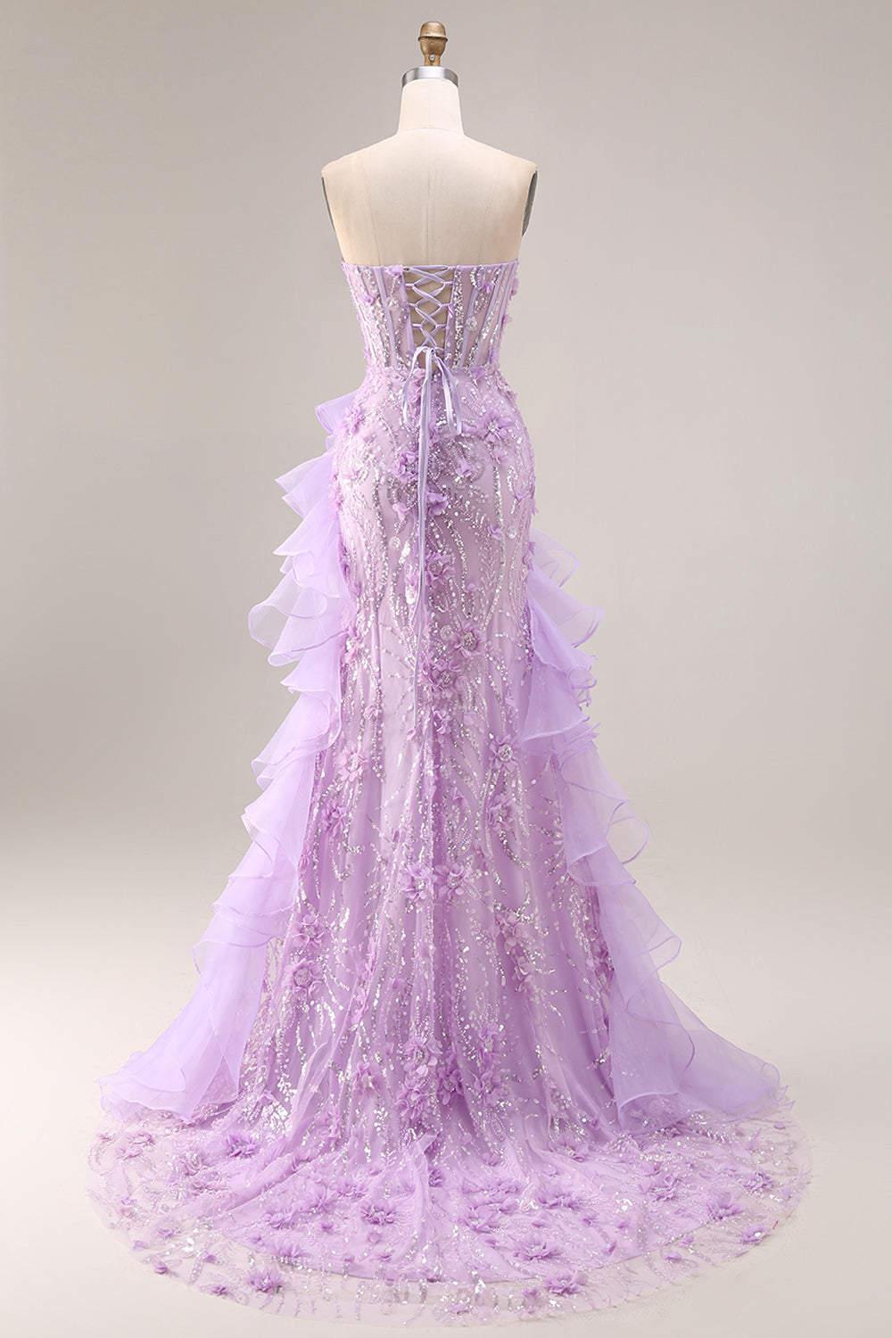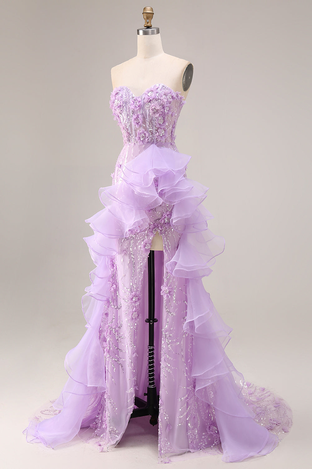 Sparkly Lilac Sweetheart Ruffled Sheath Side Slit Long Prom Dress with 3D Flowers