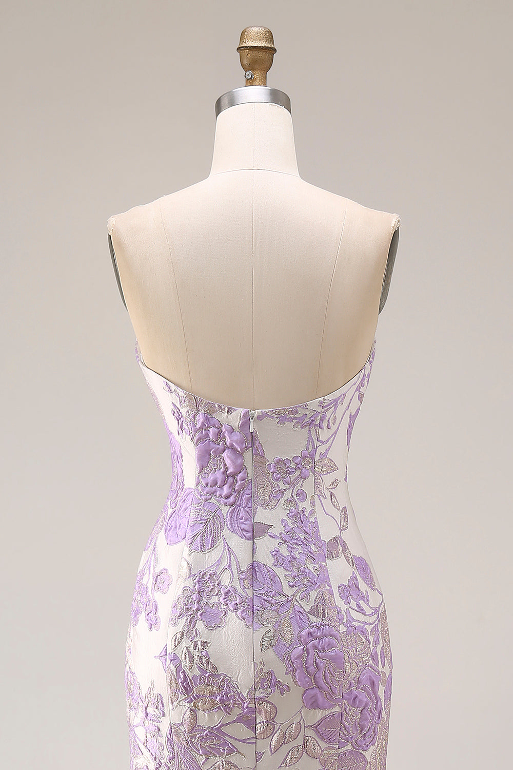 Strapless Mermaid Lilac Jacquard Satin Brocade Long Floral Prom Dress