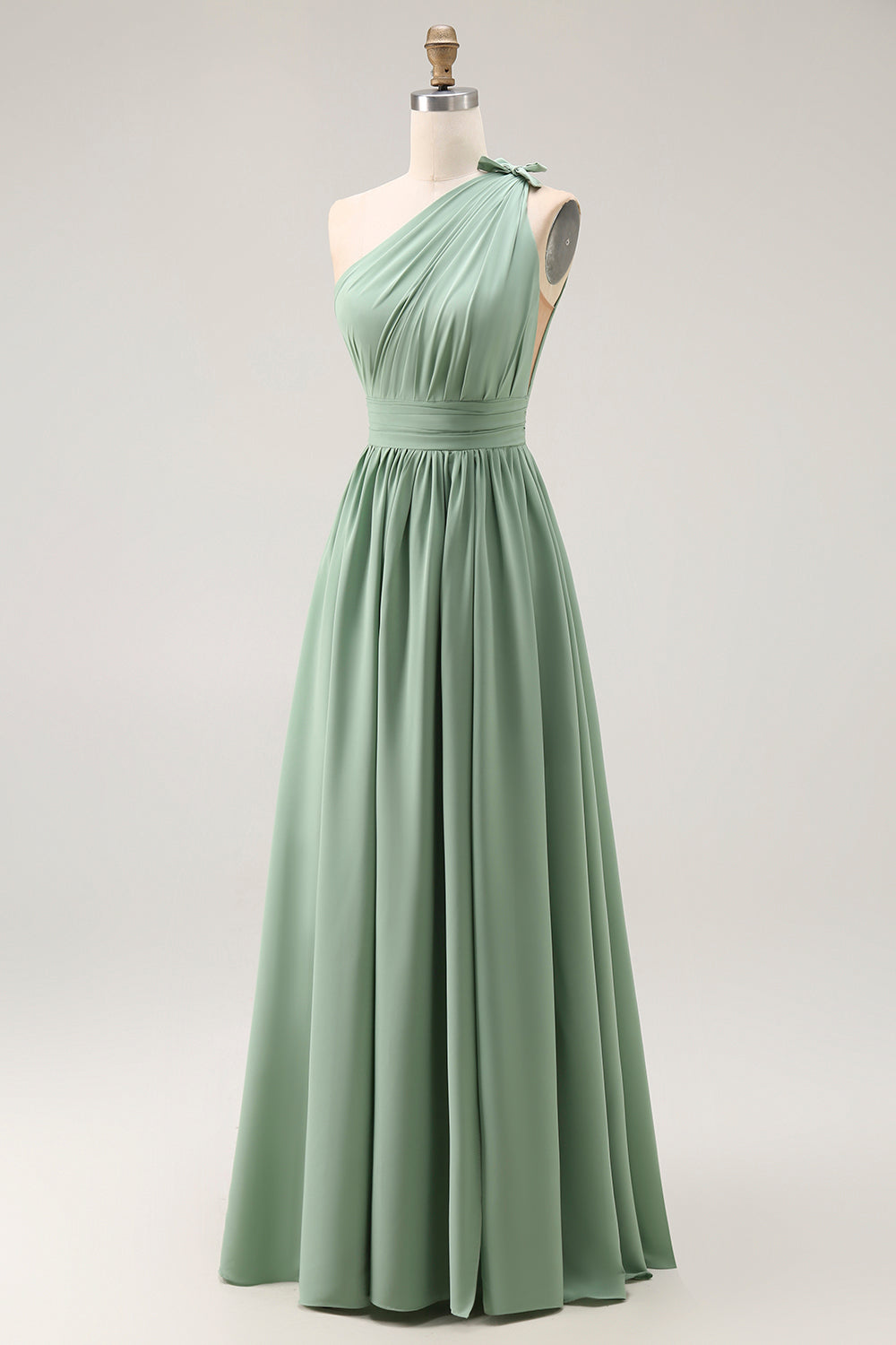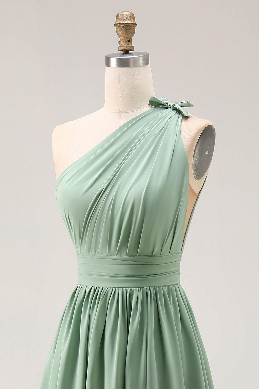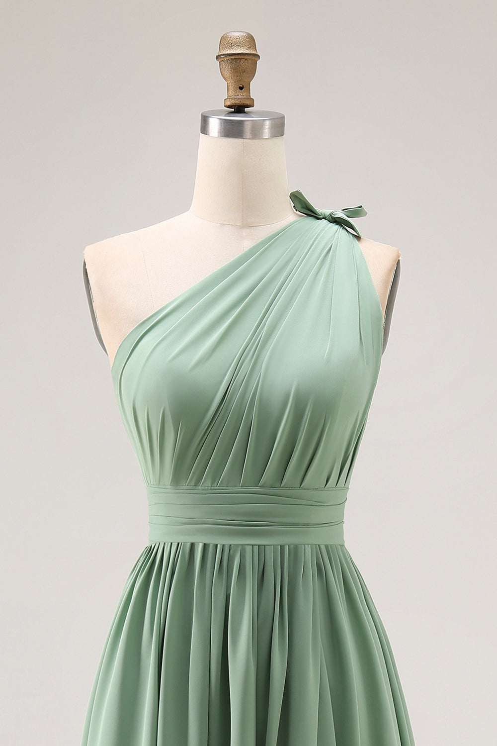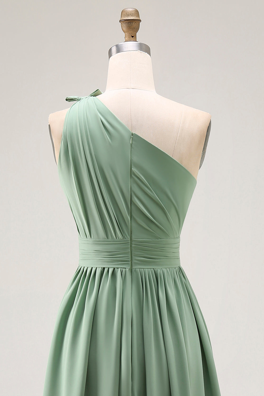 Green A Line One Shoulder Ruched Bridesmaid Dress with Slit