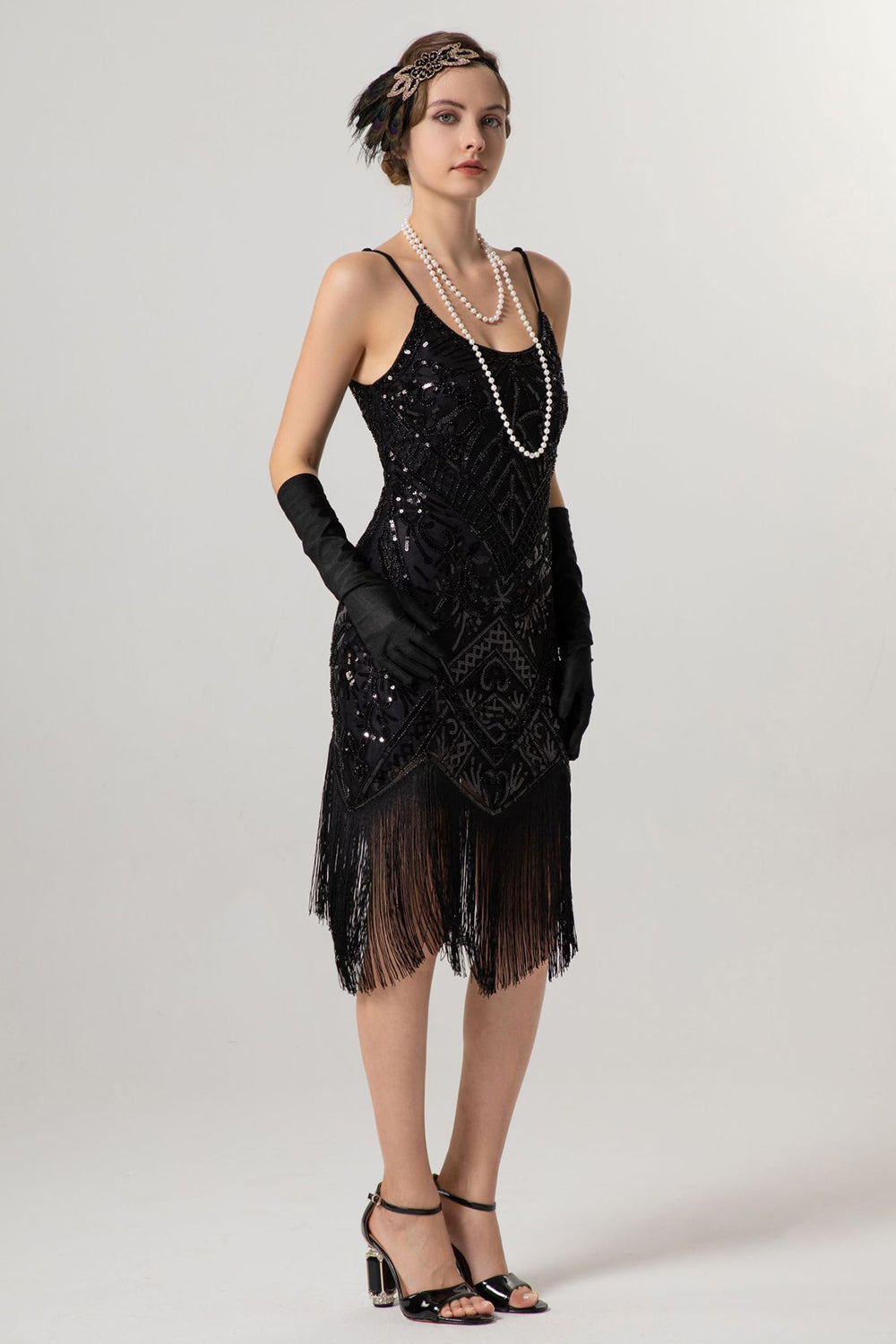 Black Golden Sheath Sequin 1920s Flapper Dress with Tassles