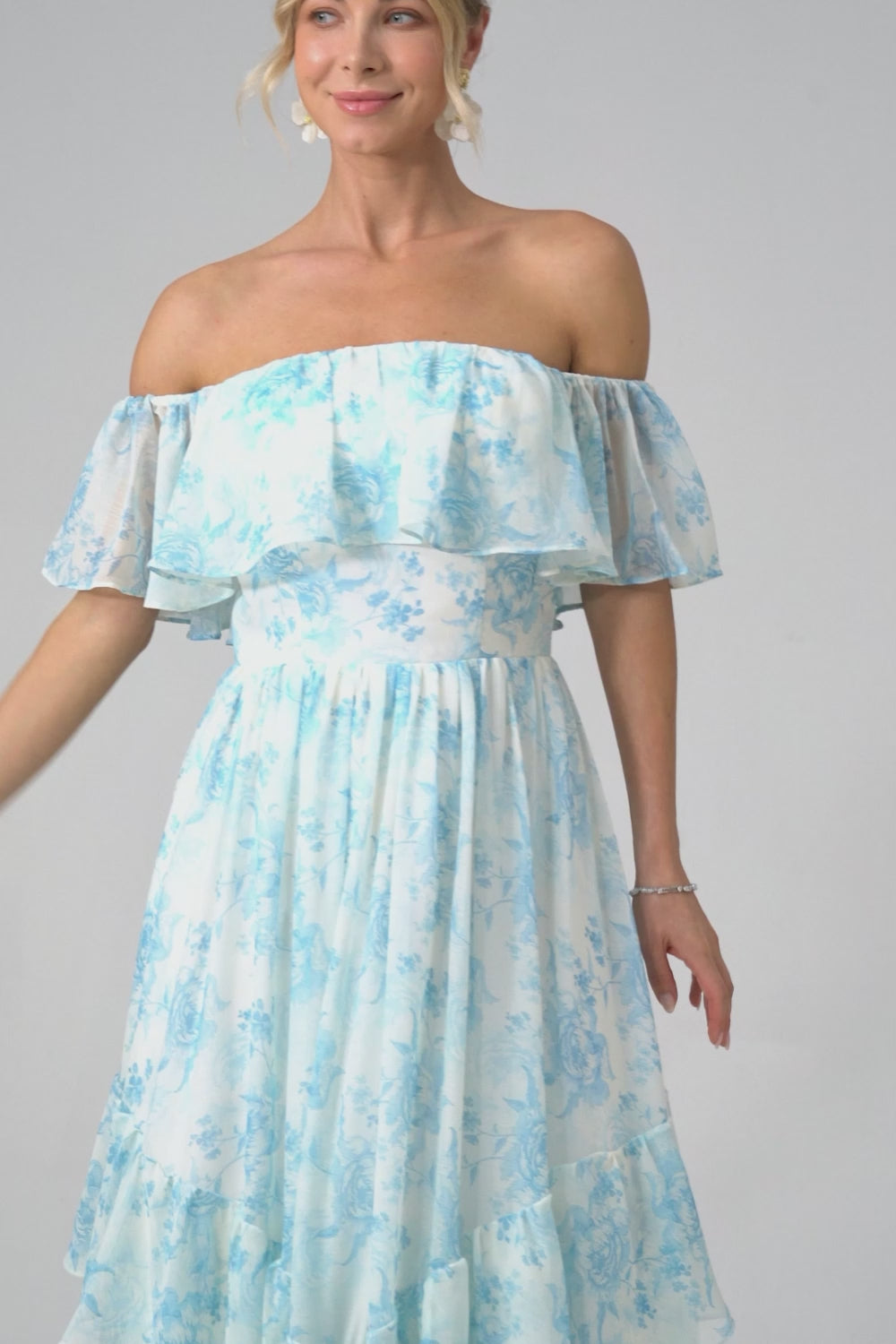 White Blue Floral Off The Shoulder Tiered Long Bridesmaid Dress
