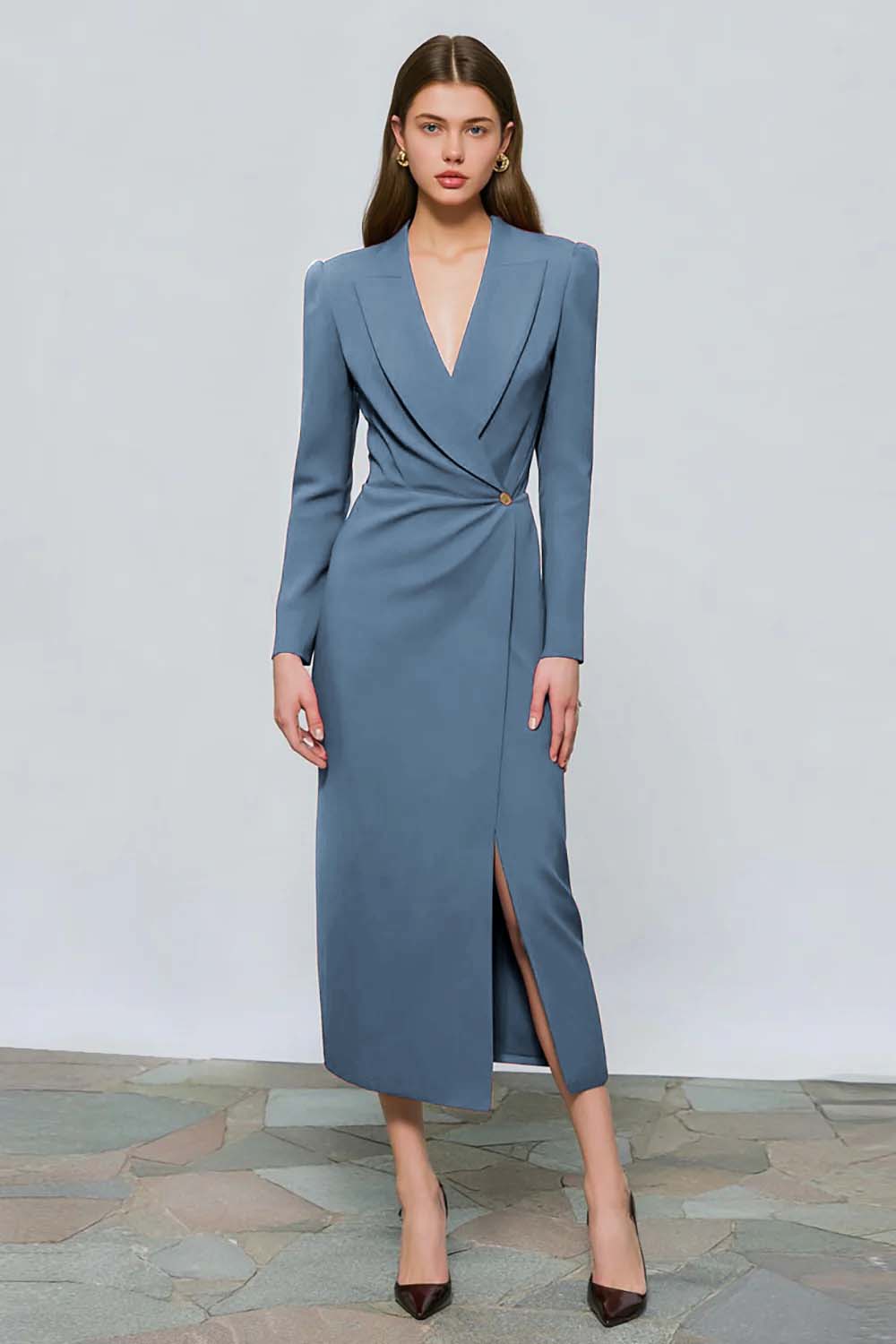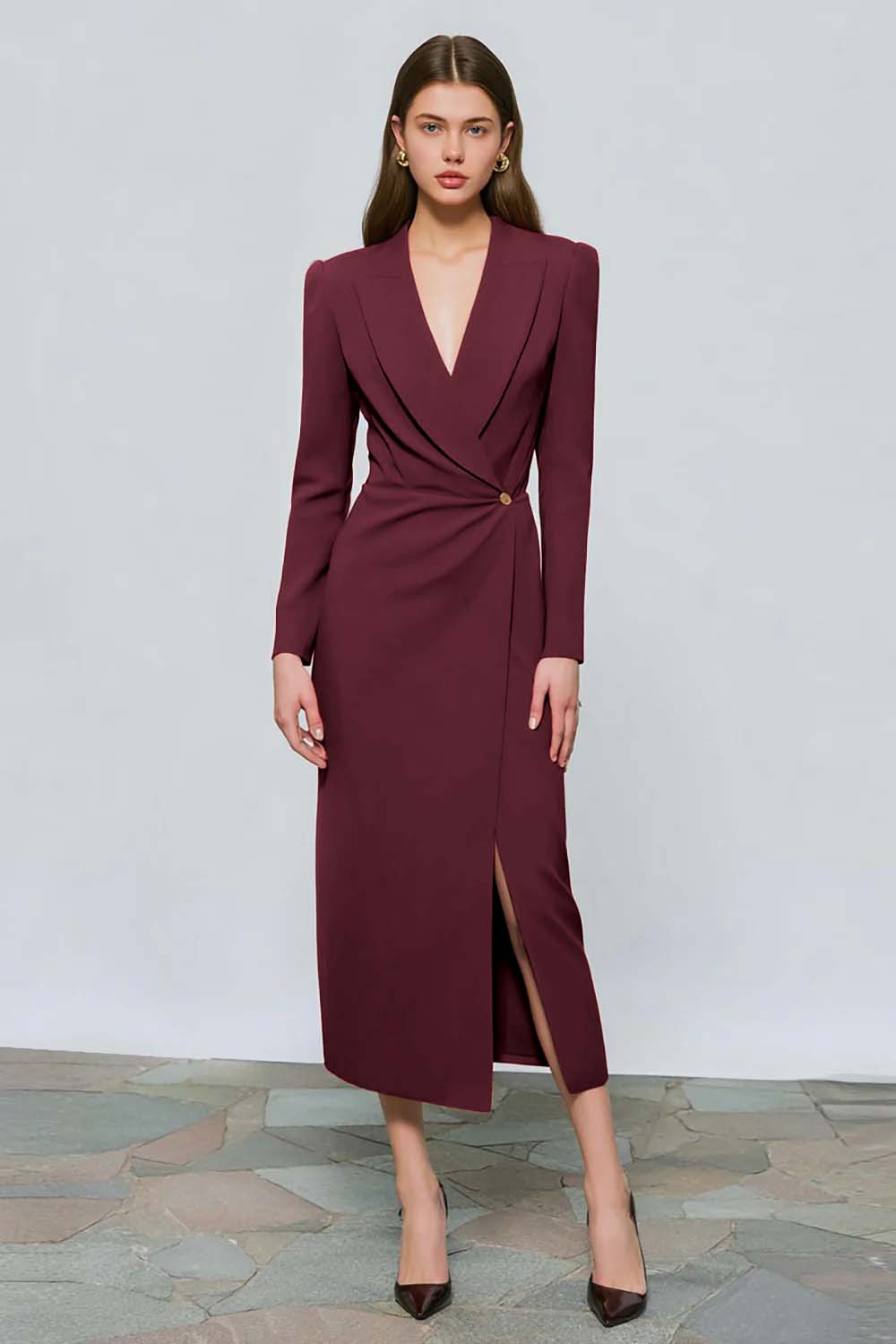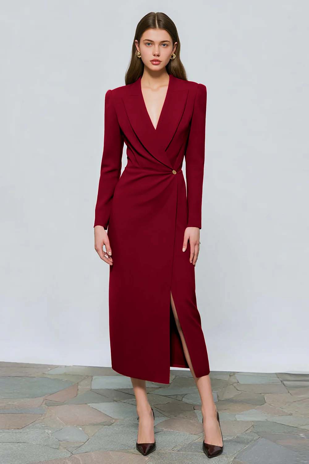Red Peak Lapel Sheath Long Sleeve Work Dress with Slit