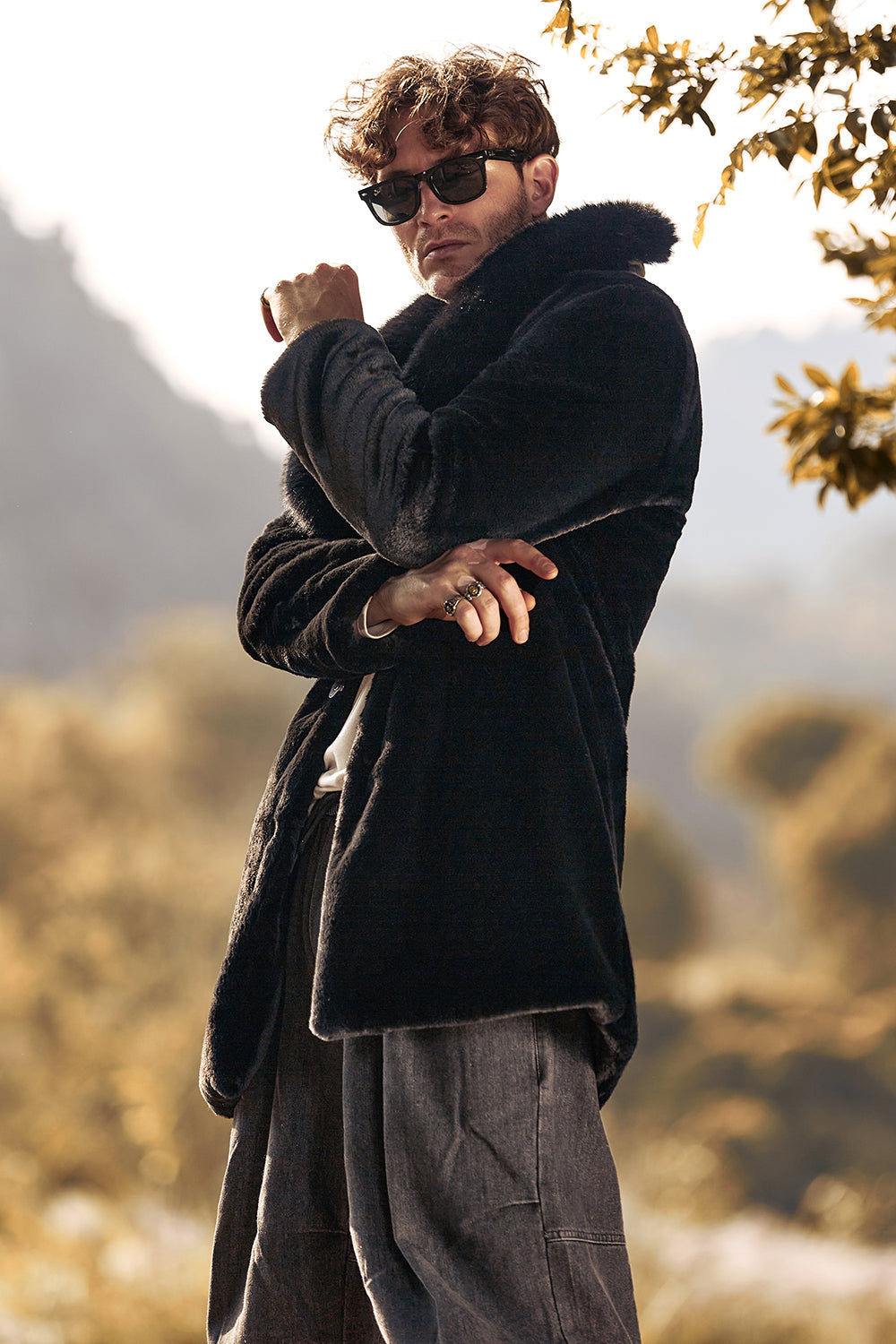 Black Luxury Faux Fur Winter Long Men's Coat with Long Sleeves