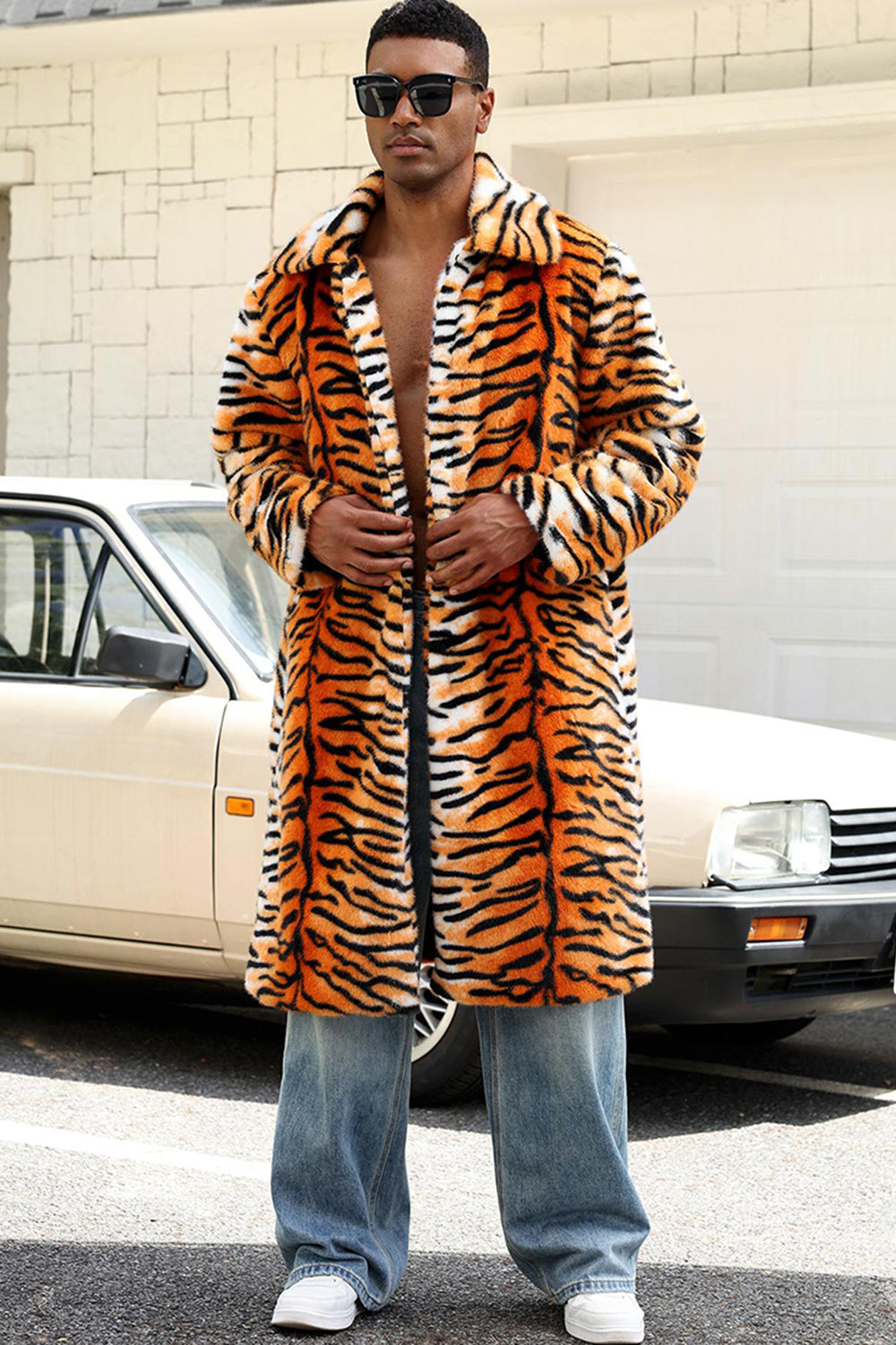 Men's Yellow Open Front Shawl Collar Long Faux Fur Coat