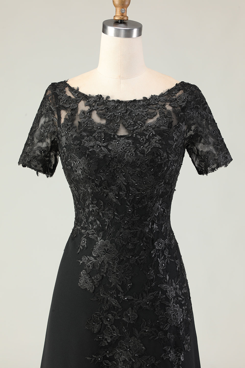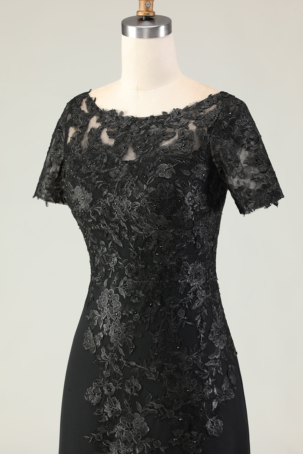 Black Sheath Satin Appliqued Long Mother of the Bride Dress with Sleeves