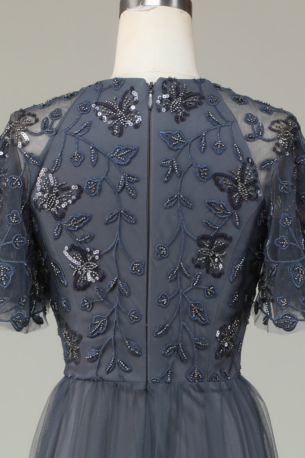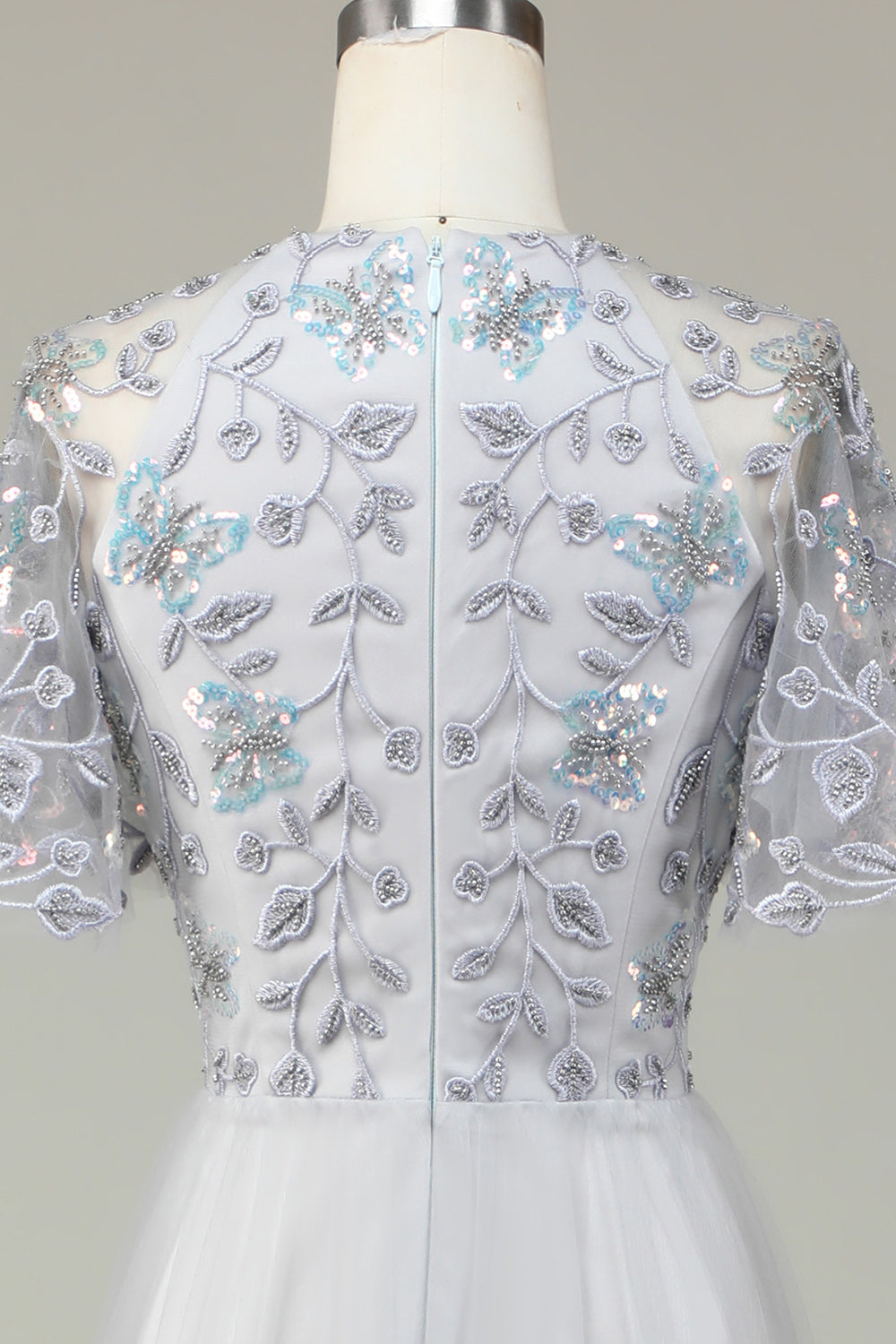 A-Line Tulle Beaded Long Grey Bridesmaid Dress with Appliques