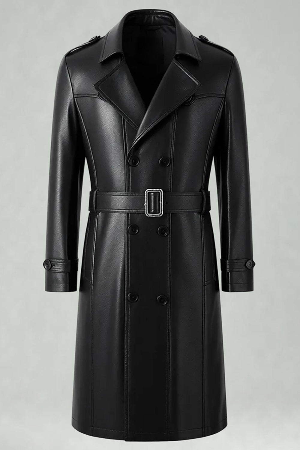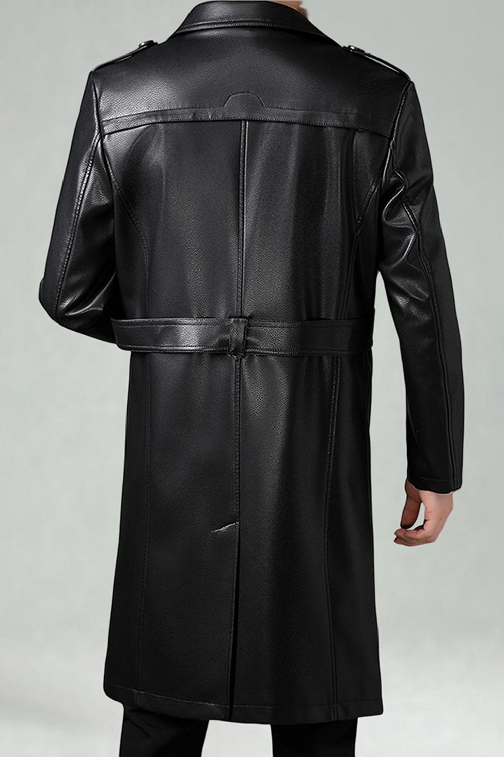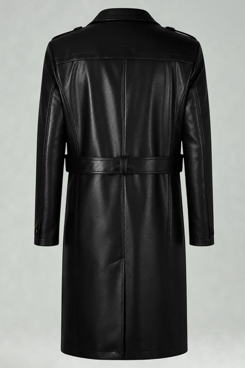 Black Notched Lapel Leather Double Breasted Men's Long Trench Coat