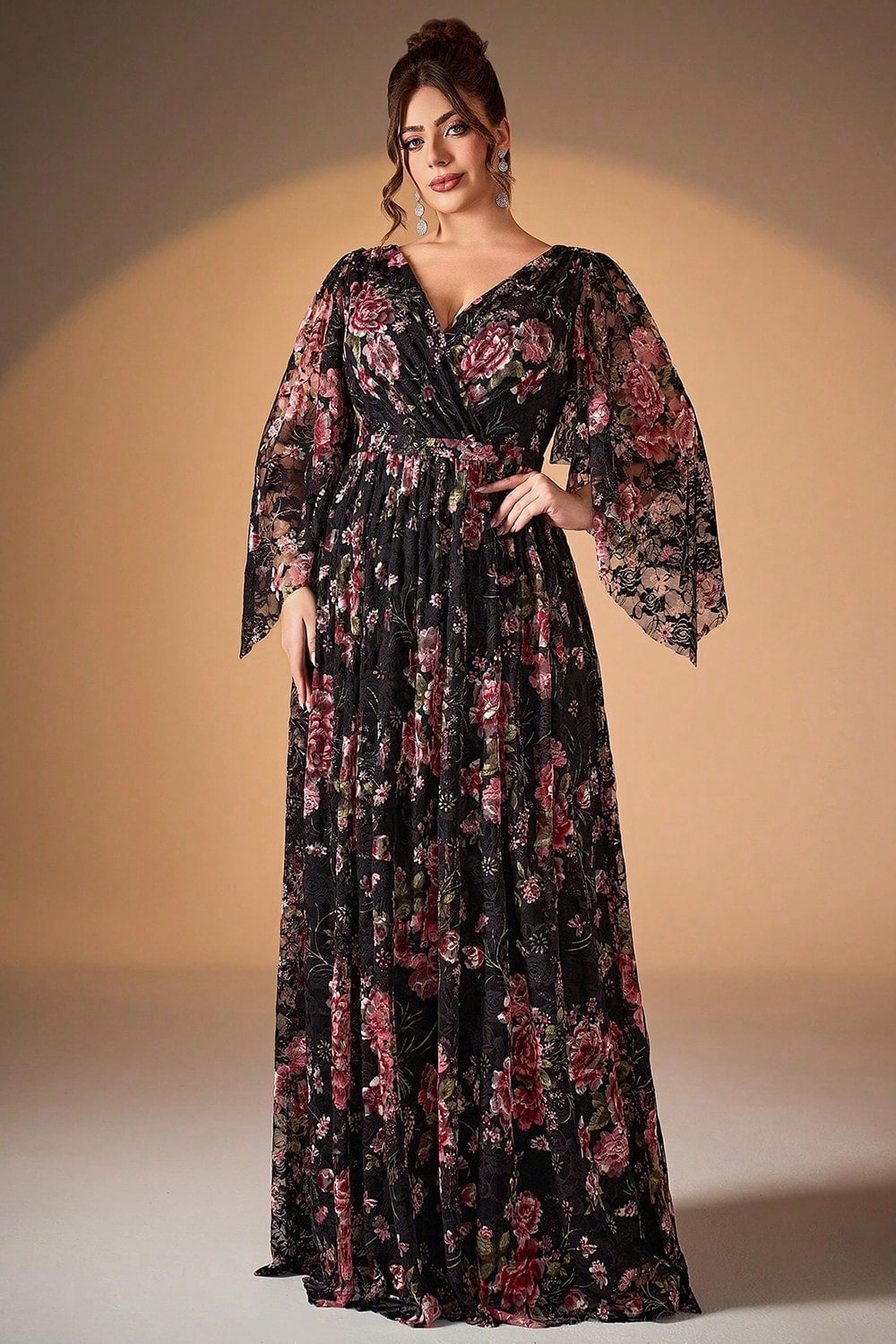 Black Pink Floral A Line Long Sleeve Mother of the Bride Dress
