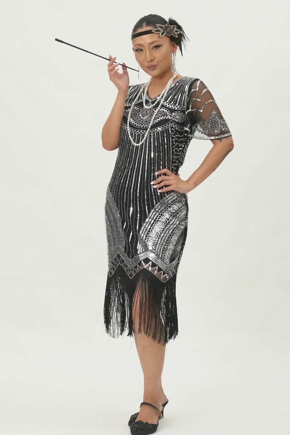 Black Silver Sequin V Neck Bodycon 1920s Dress with Tassels