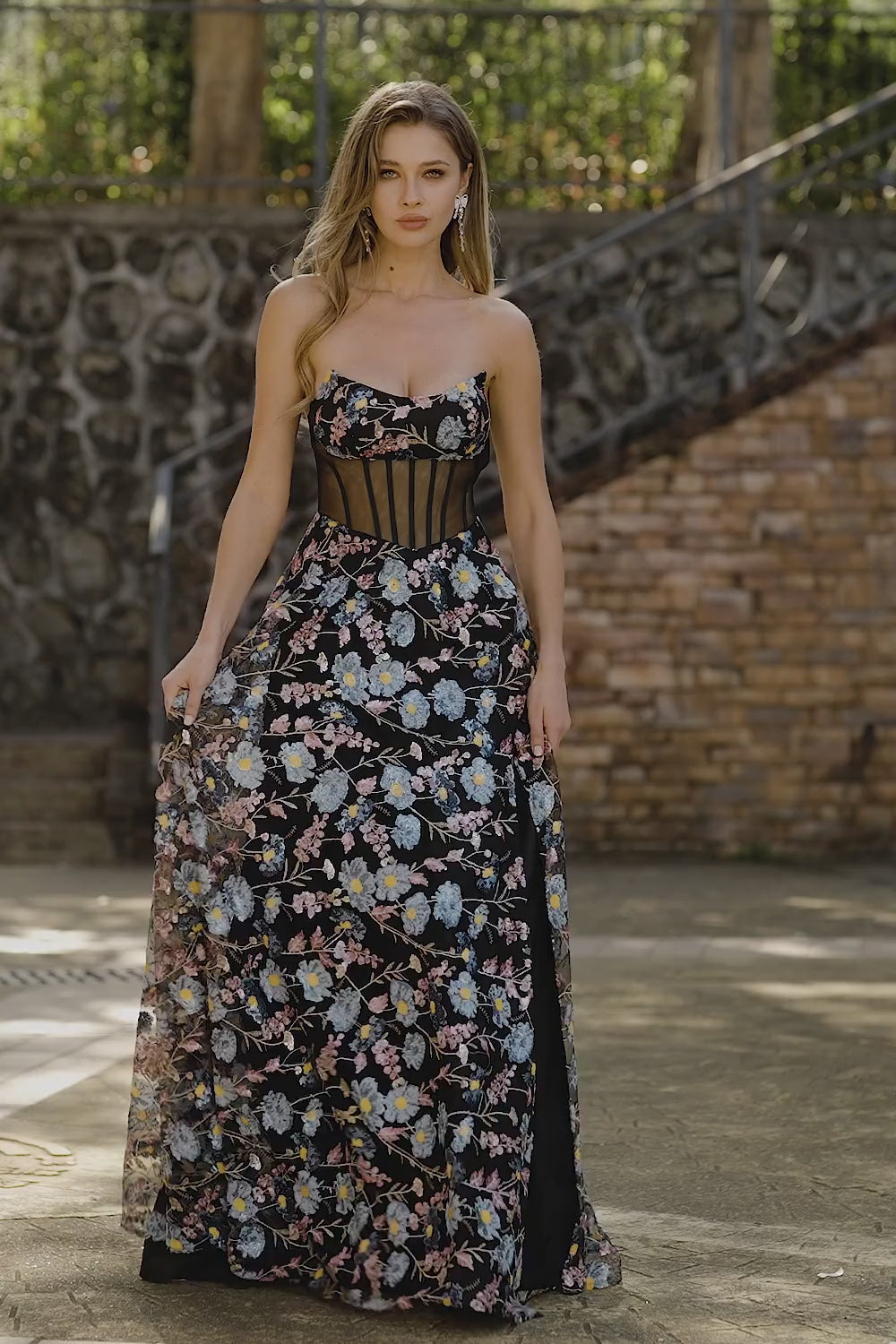 Black Strapless Floral A Line Sheer Corset Long Prom Dress with Slit