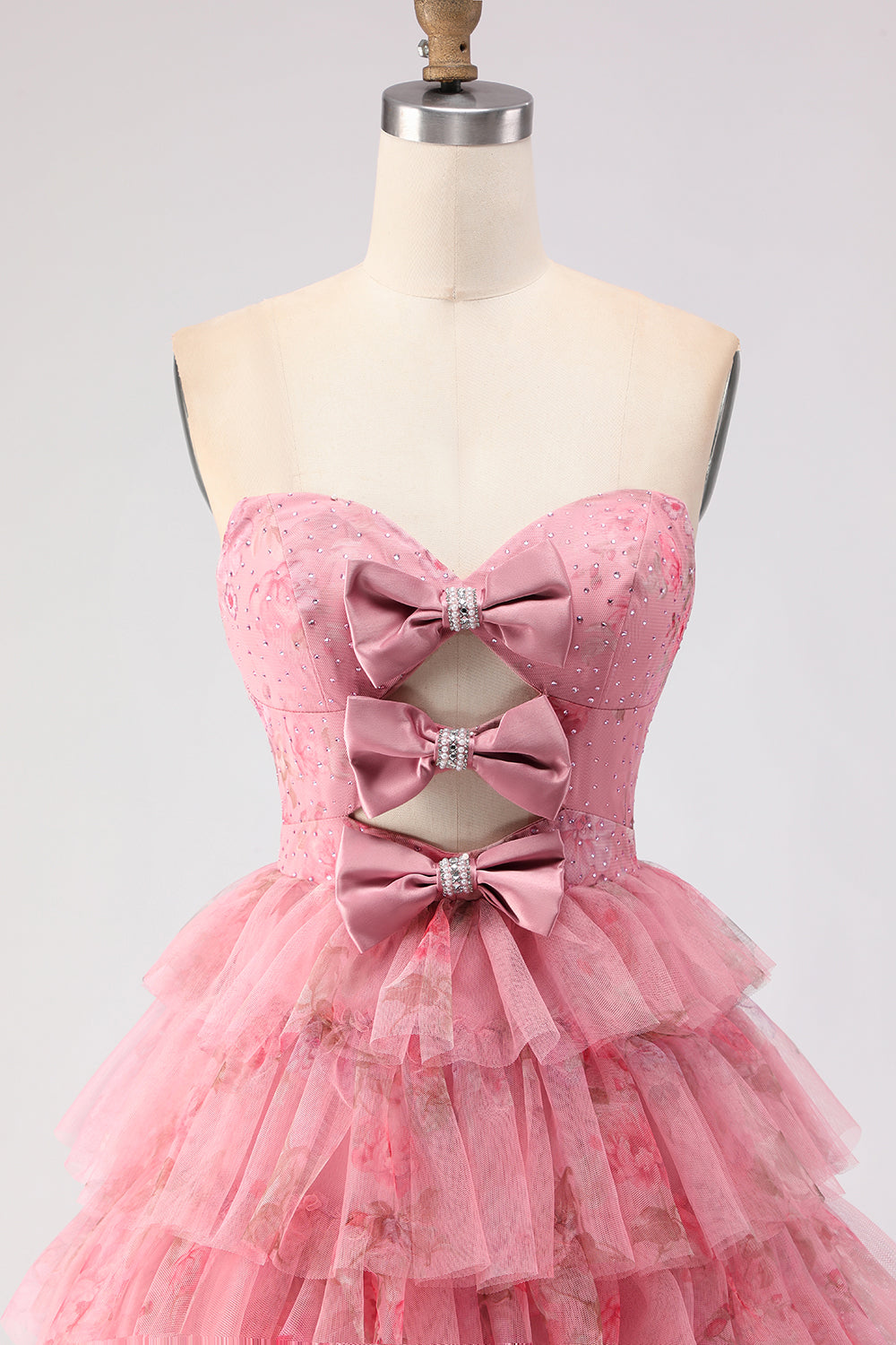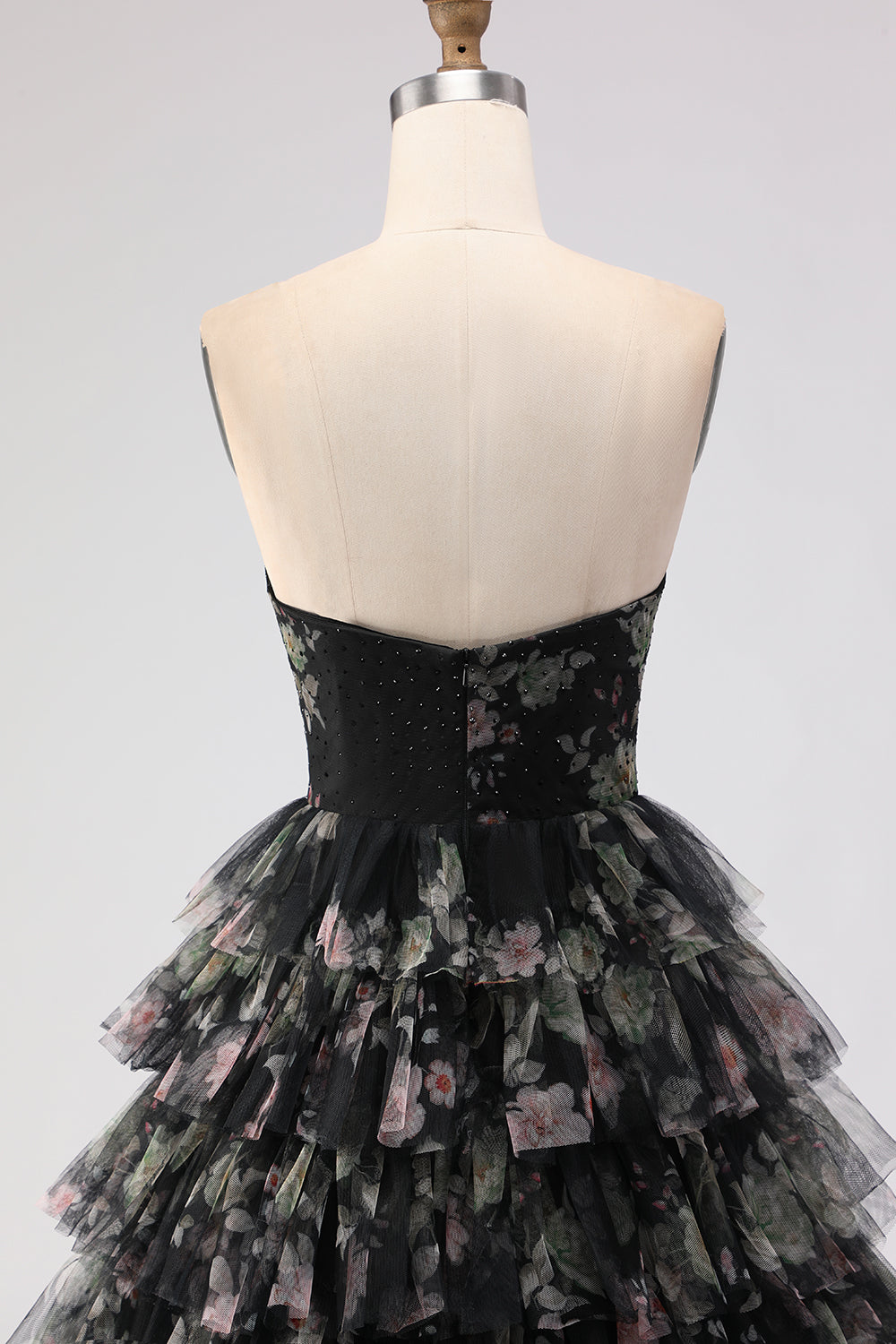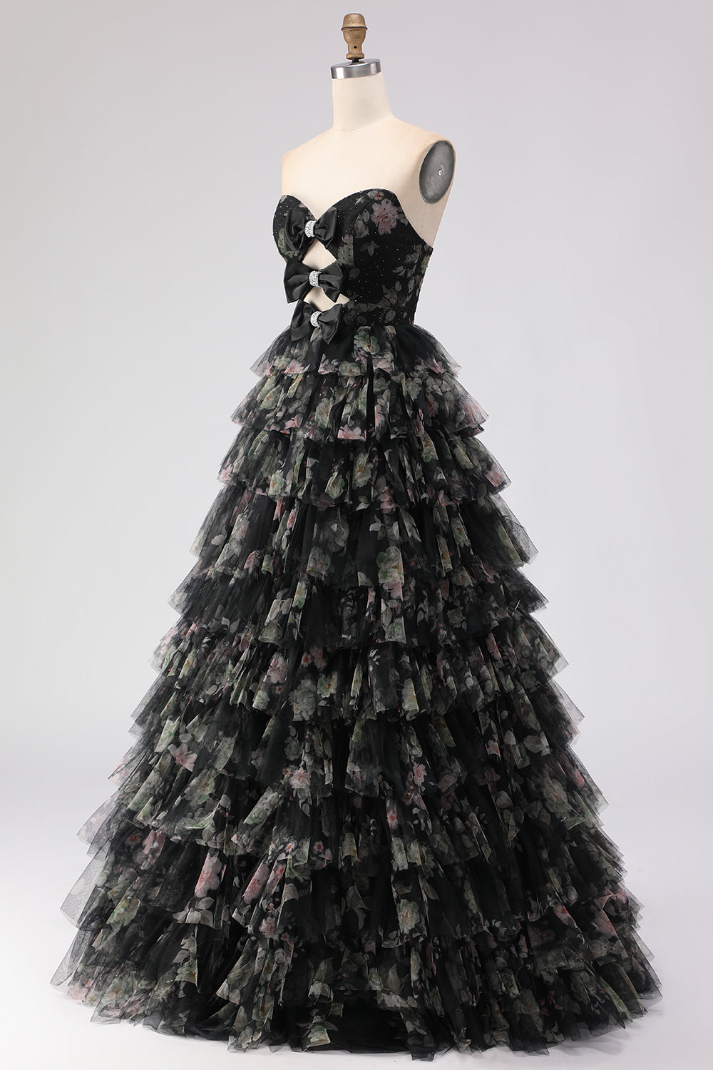 Black Tiered Ruffle A-Line Strapless Cut Out Long Prom Dress with Bows