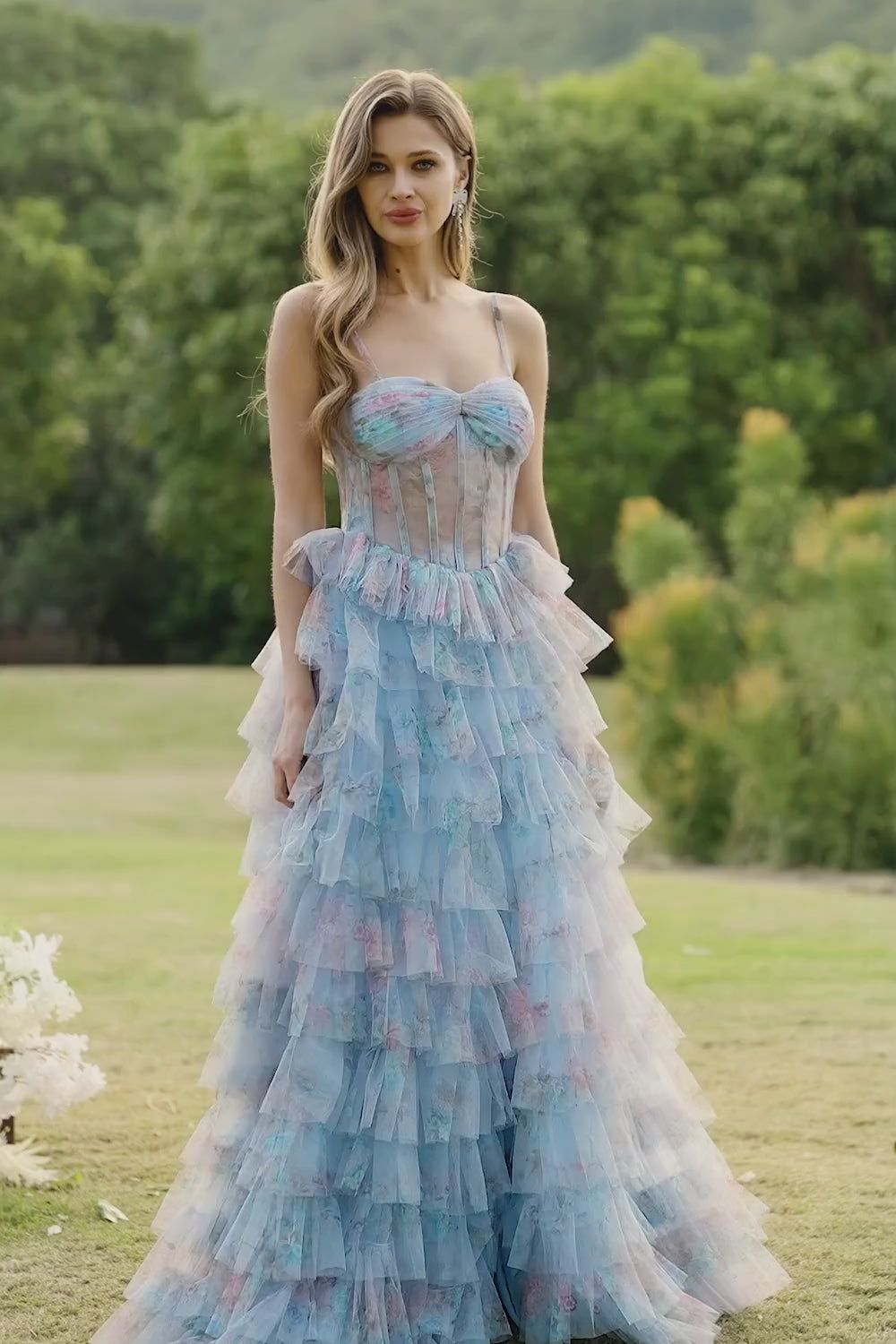 Blue A-Line Floral Tiered Ruffle Corset Long Prom Dress with Slit