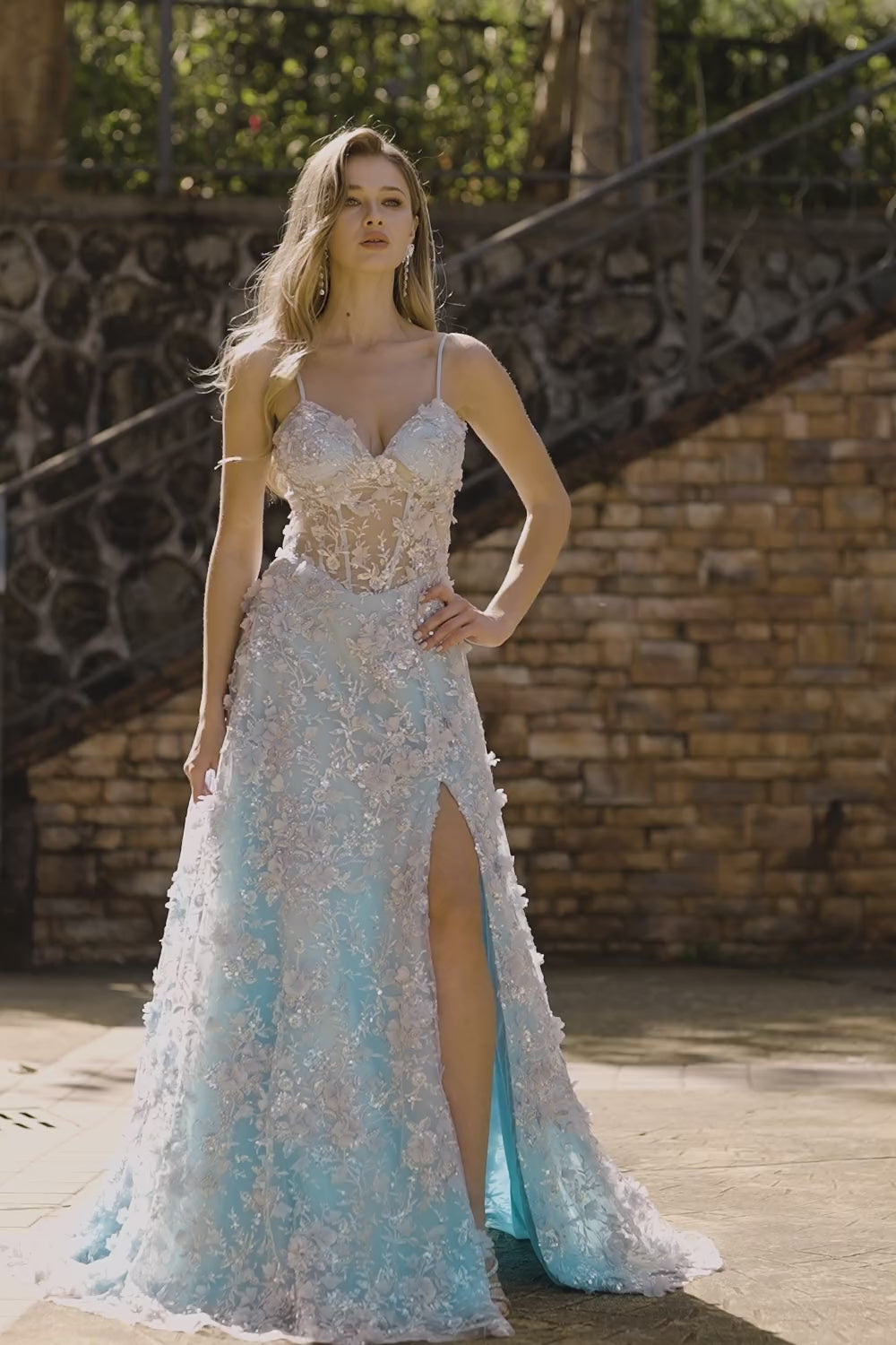 Blue Sequins A Line Sheer Corset 3D Flowers Long Prom Dress with Slit