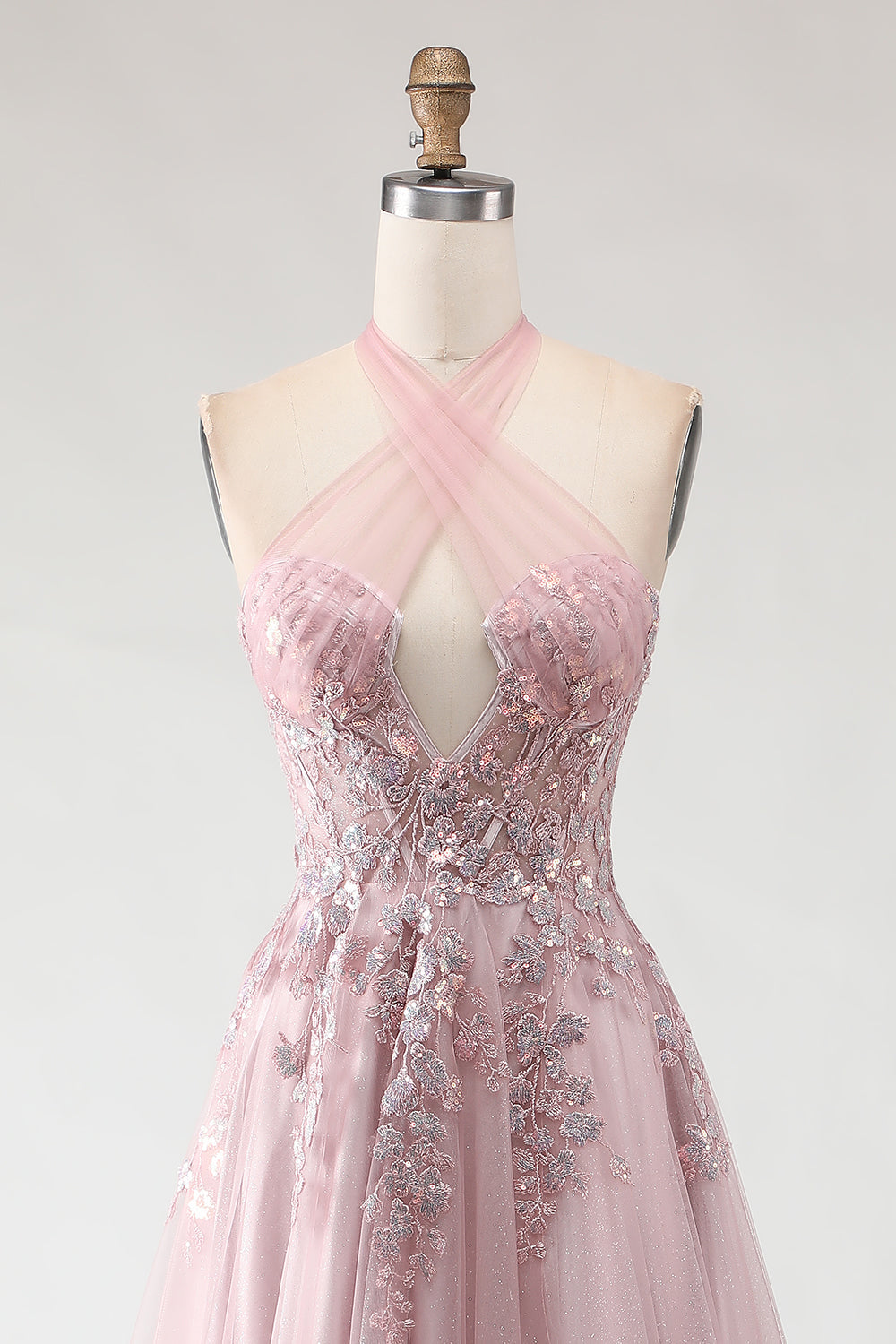Blush Pink Halter Corset Appliqued A Line Long Prom Dress with Slit