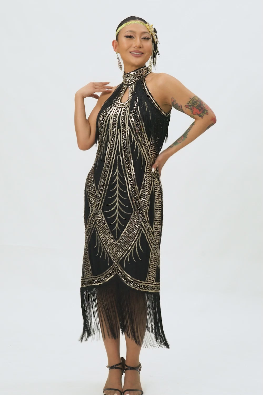 Bodycon Halter Black Golden Sequin 1920s Dress With Fringes
