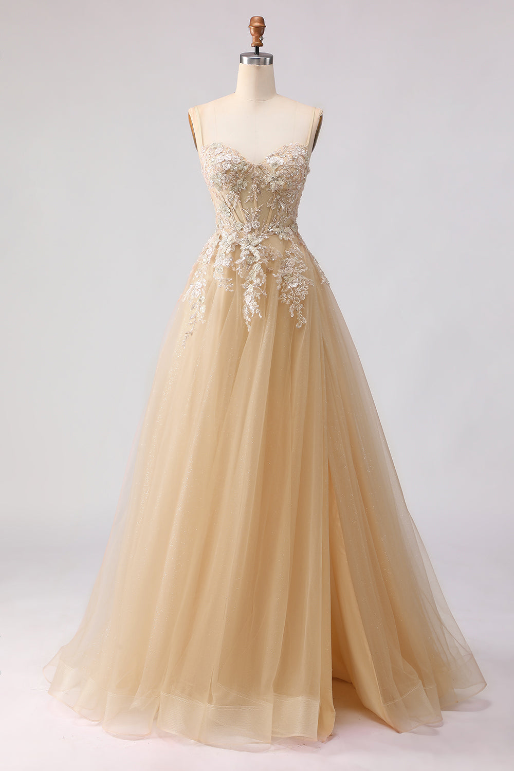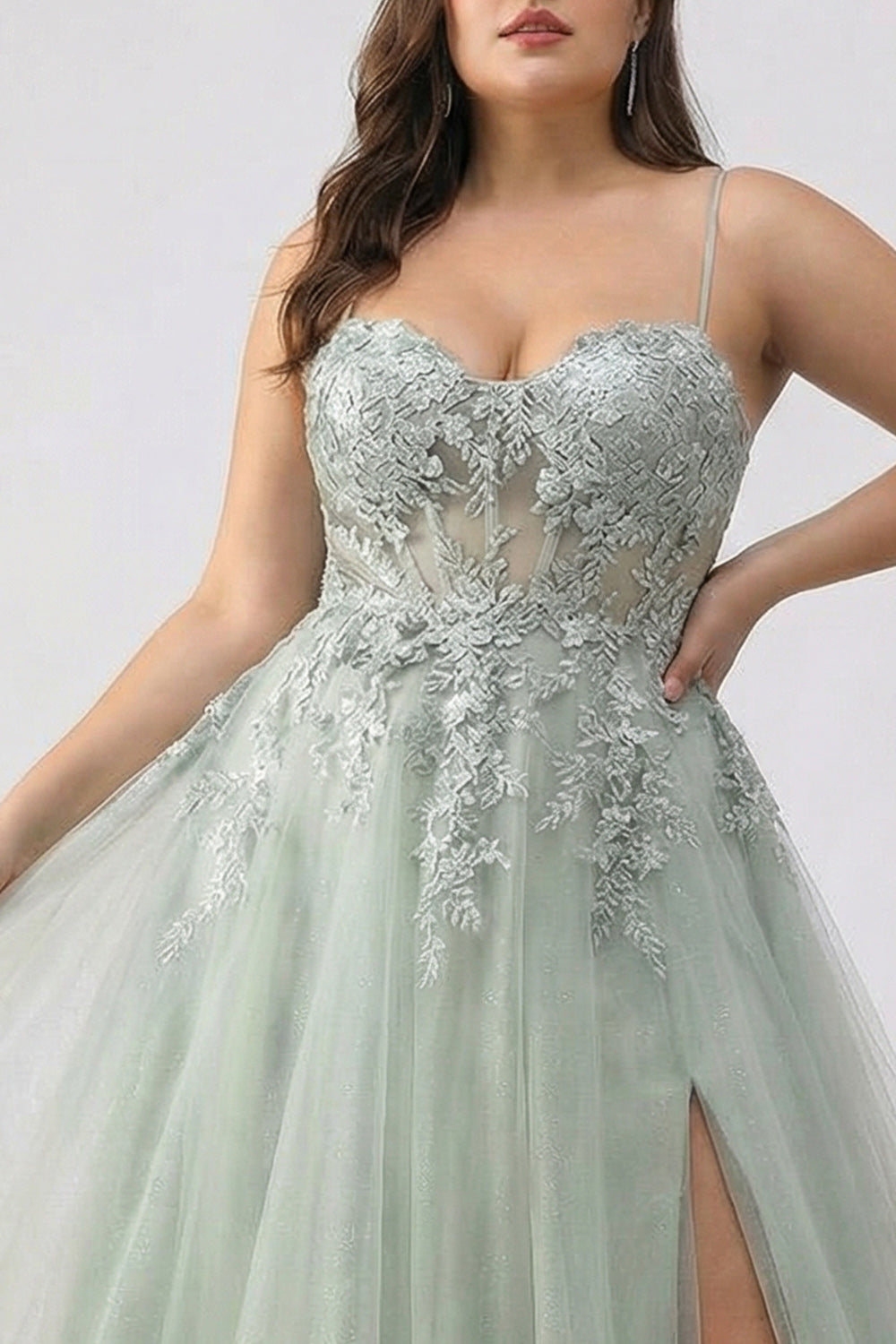 Sage Green A-Line Embroidered Corset Long Tulle Prom Dress with Slit