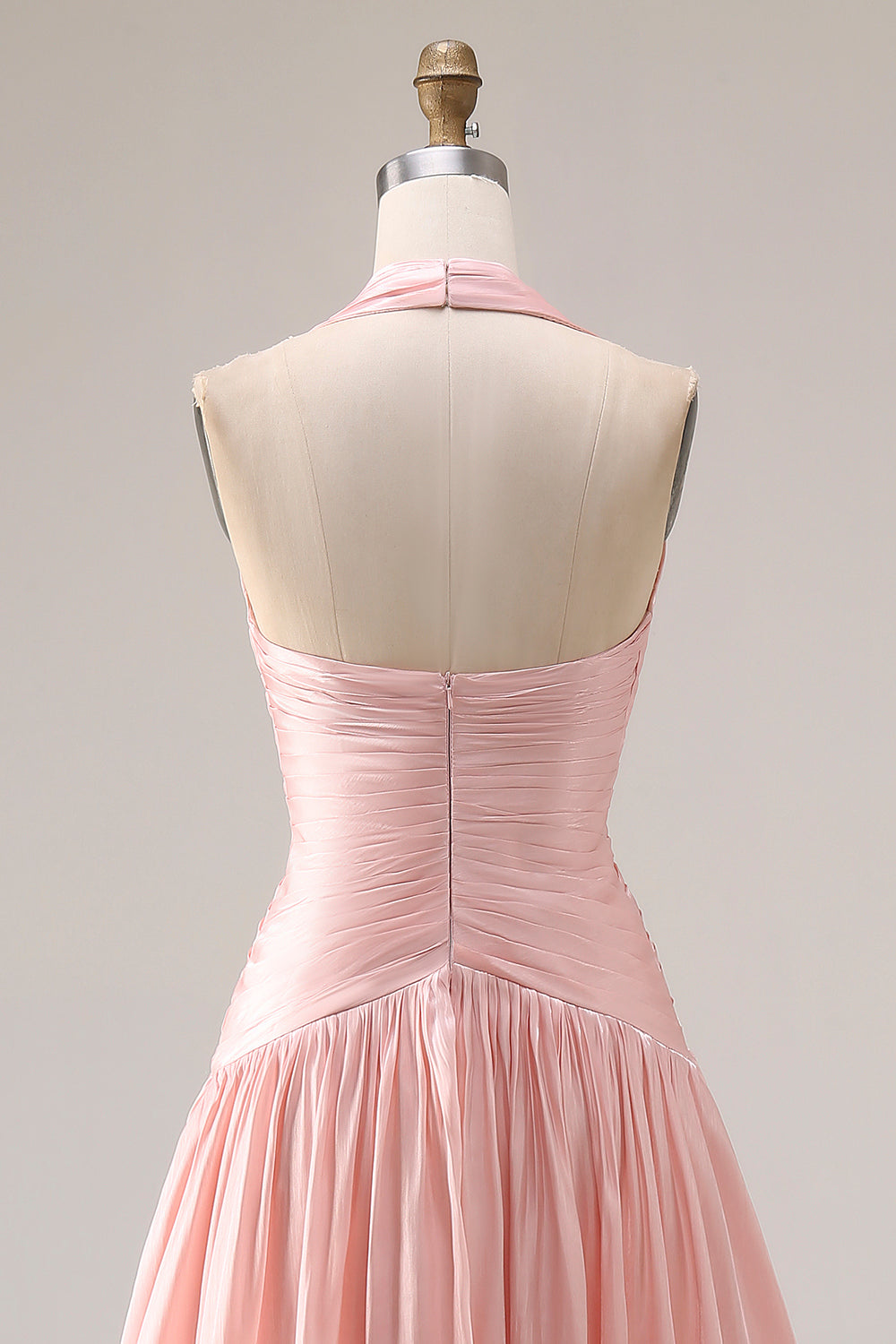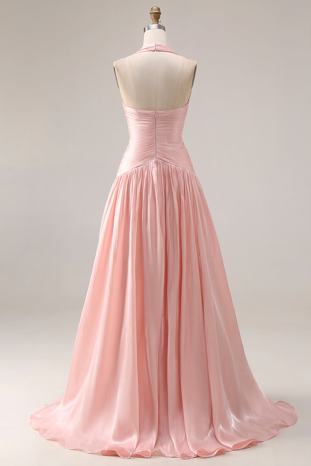 Halter Blush Pink A-Line Pleated Long Prom Dress with Slit