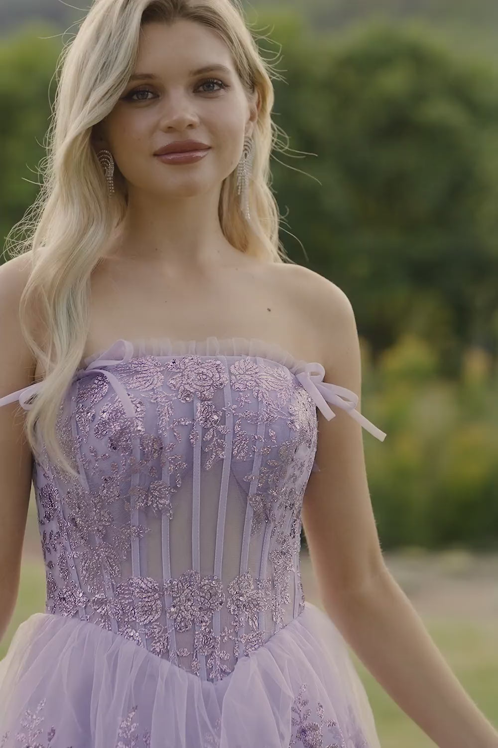 Lilac A Line Strapless Sequin Corset Tiered Ruffle Long Prom Dress with Slit