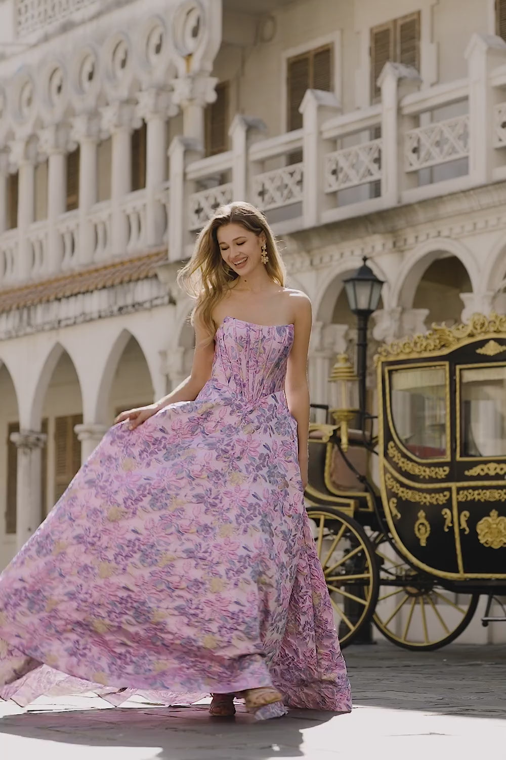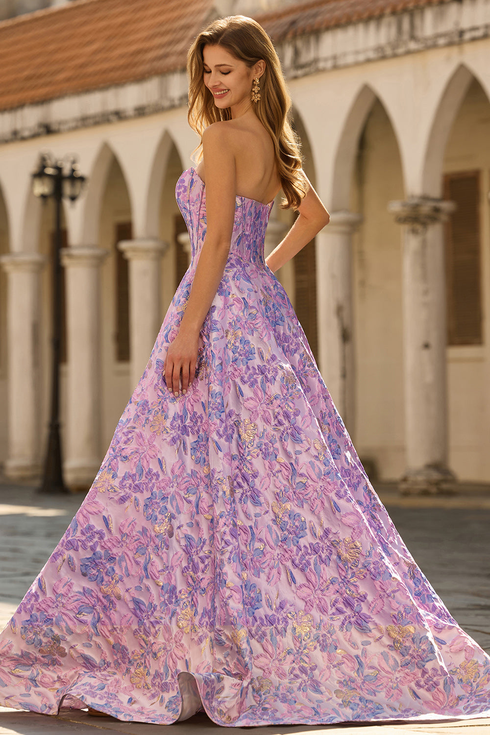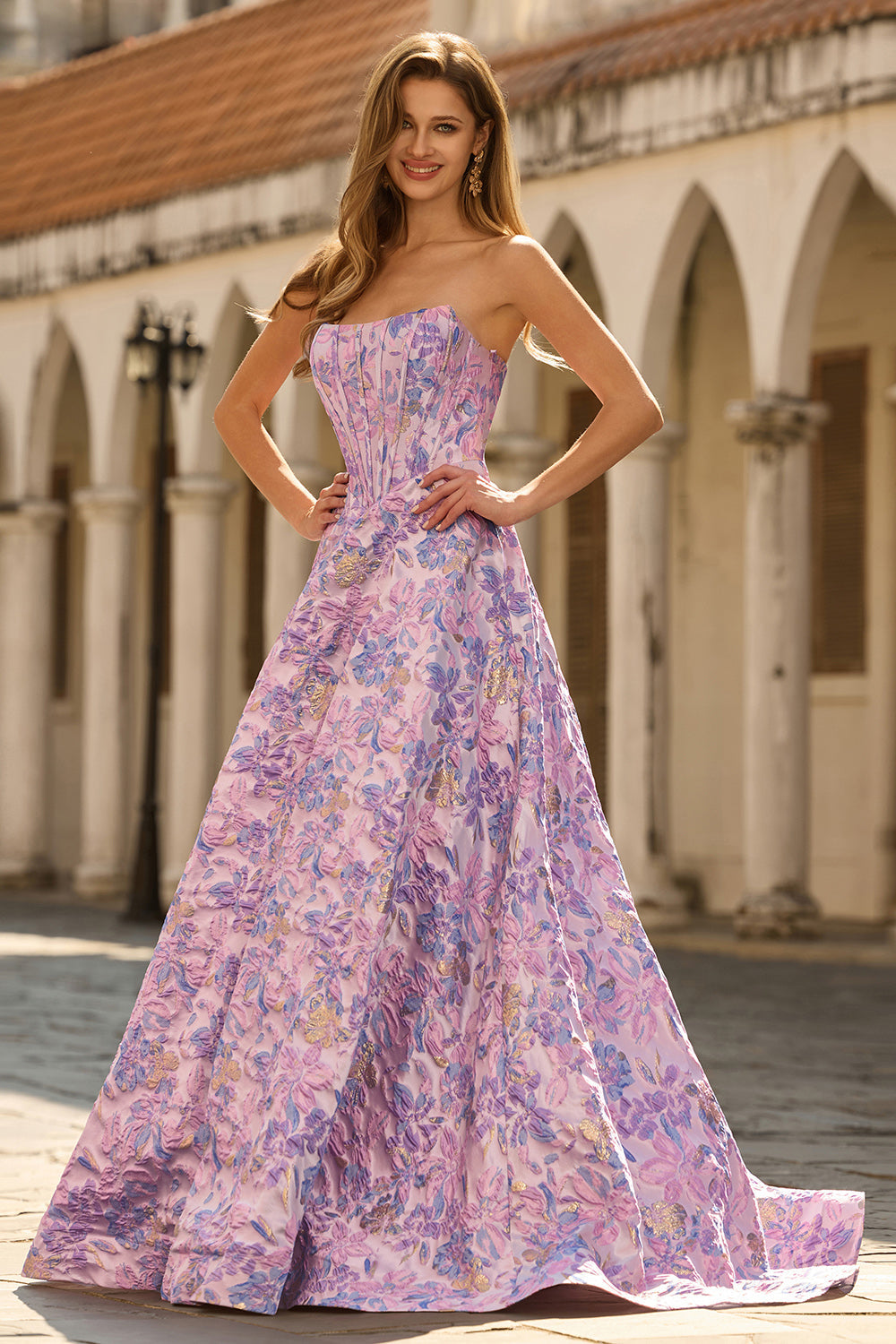 Lilac Strapless Jacquard A-Line Corset Brocade Long Prom Dress