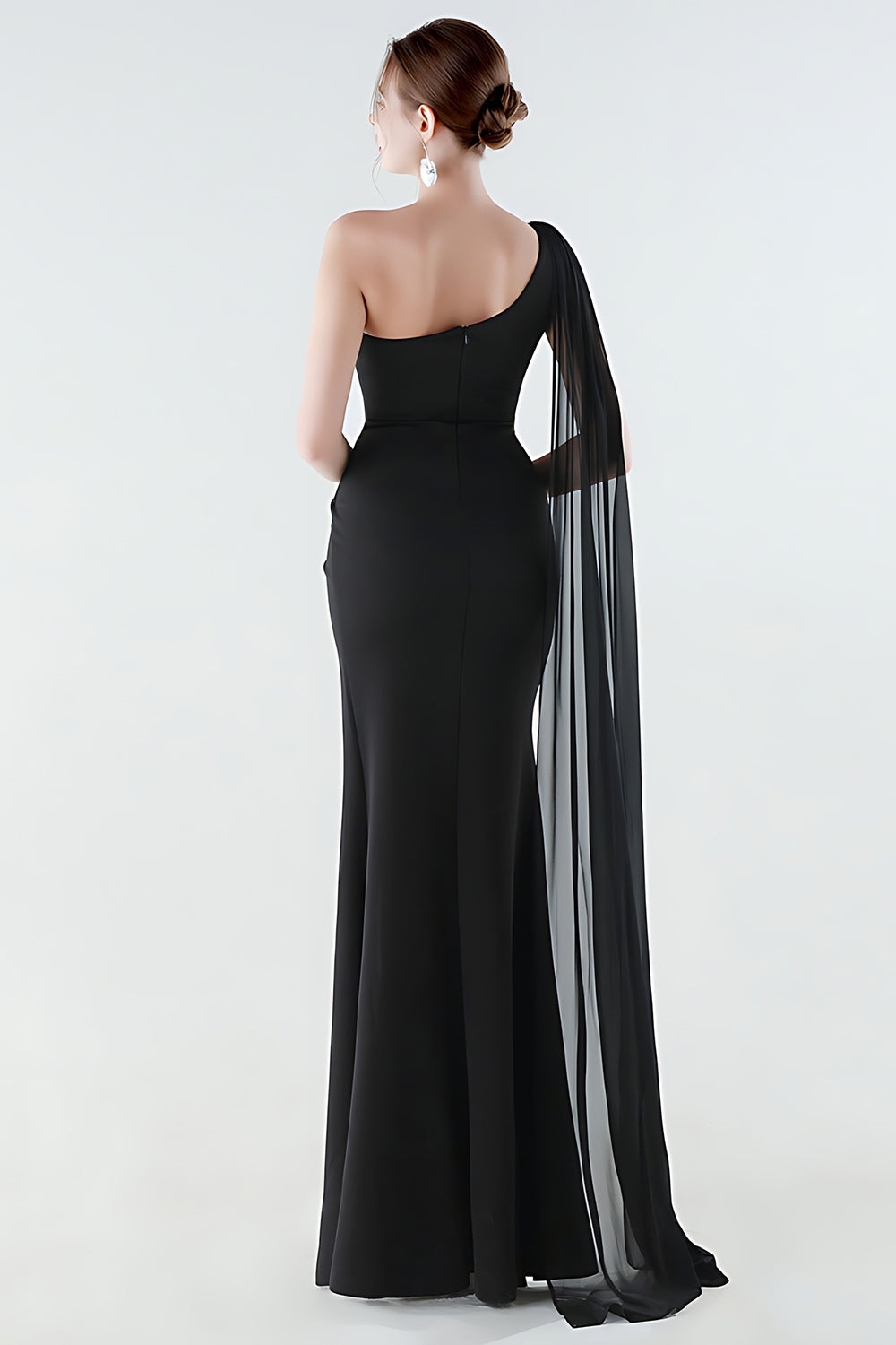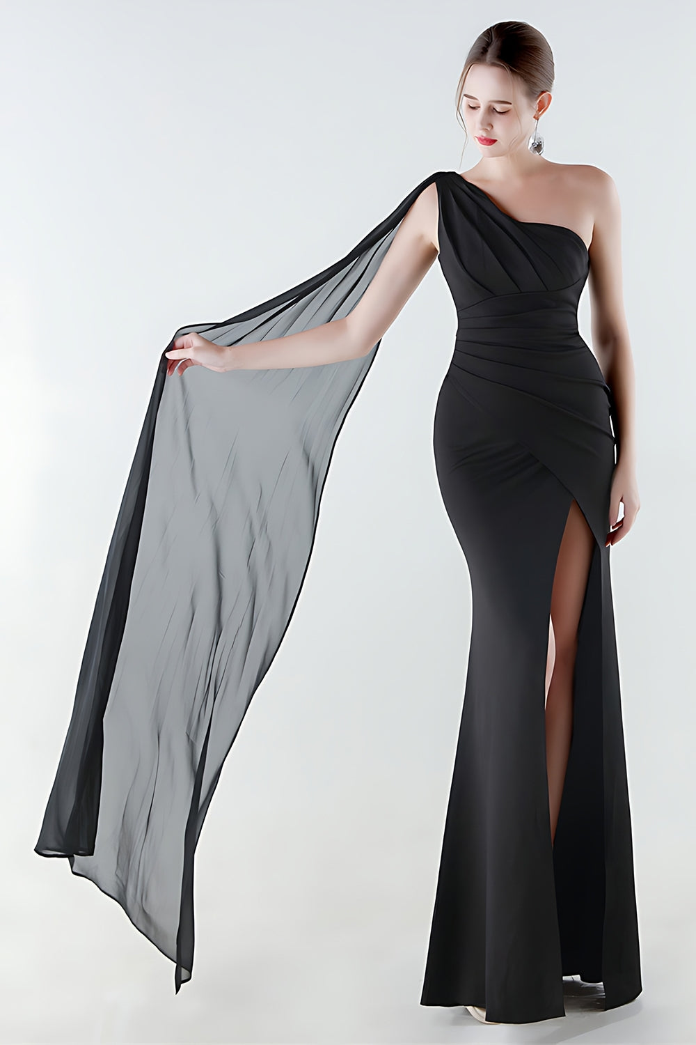 One Shoulder Black Mermaid Side Slit Formal Dress with Streamer