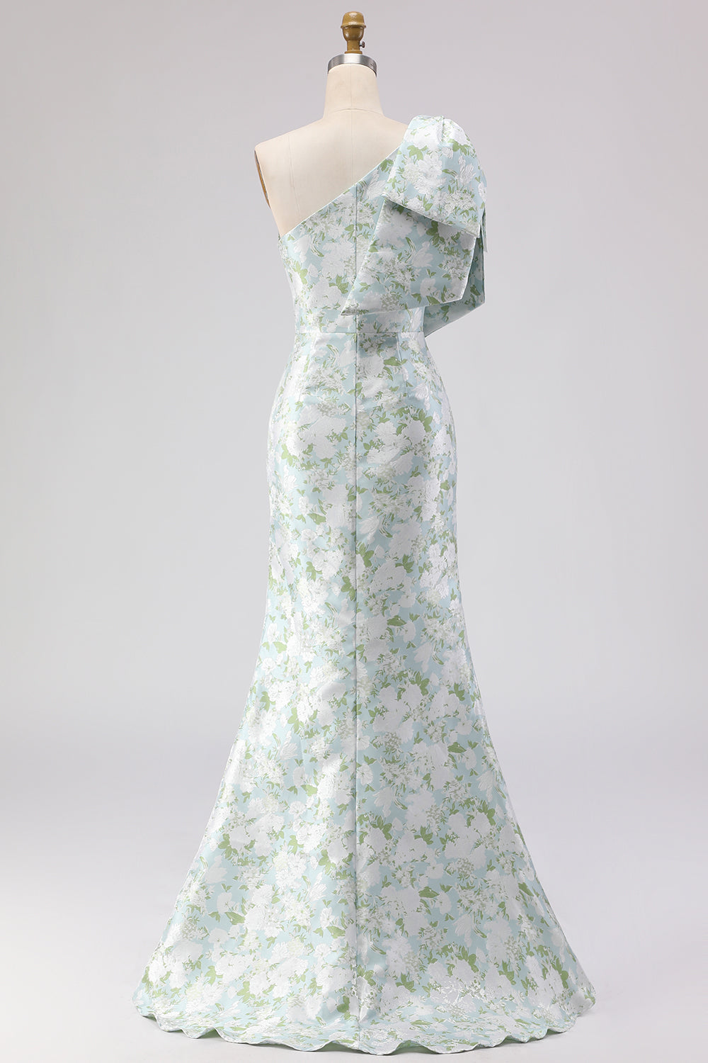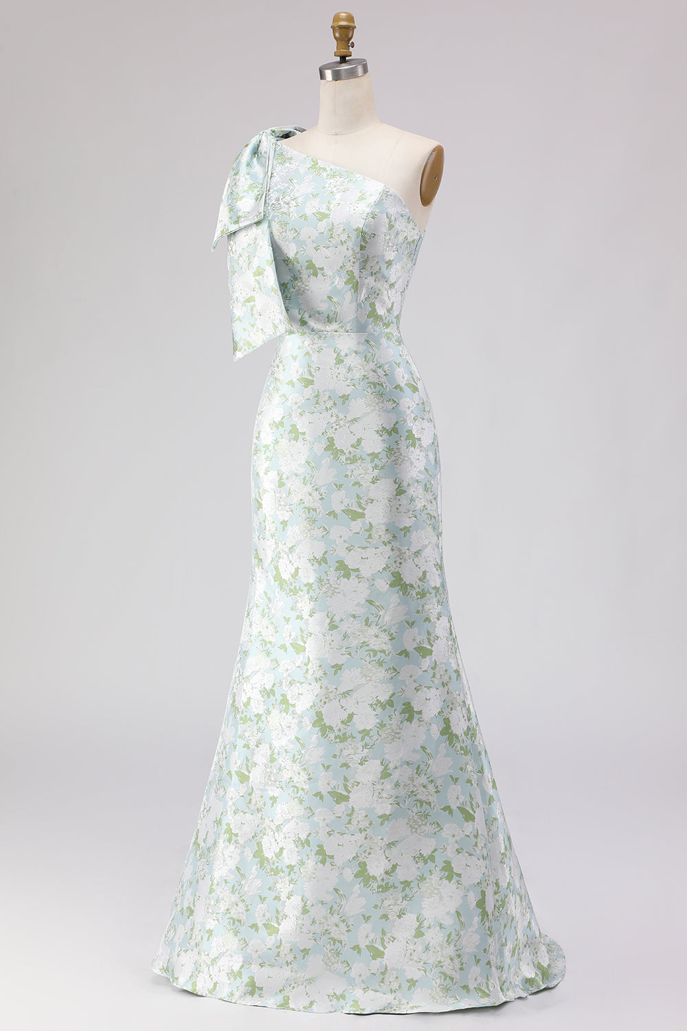 One Shoulder Blue White Flower Mermaid Print Long Bridesmaid Dress with Bow