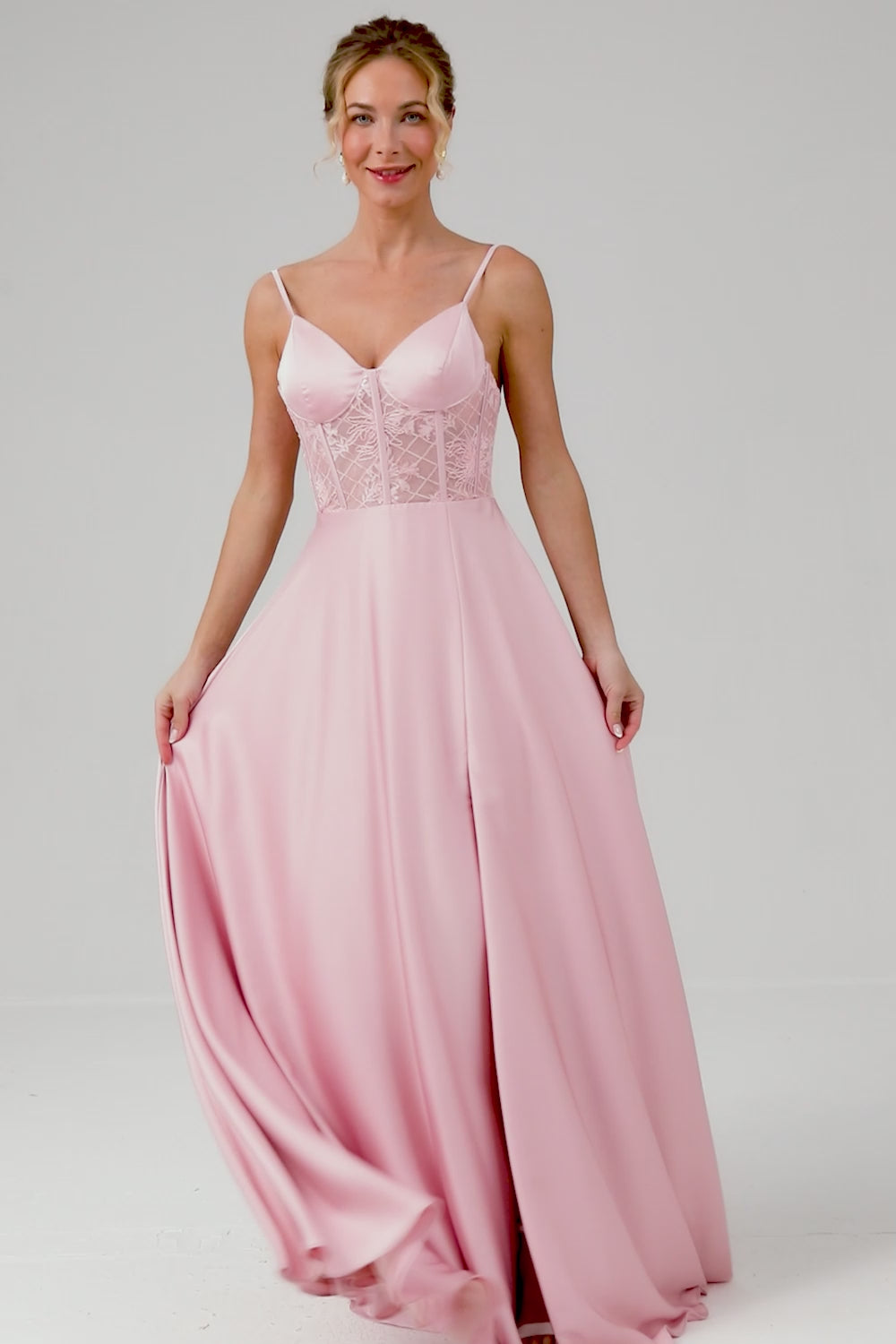 Pink A-Line Spaghetti Straps Satin Corset Long Bridesmaid Dress with Slit