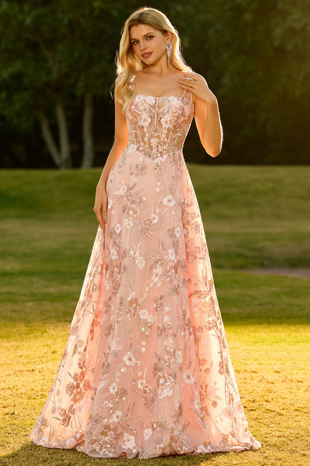 Pink Corset A Line Embroidered Long Floral Prom Dress with Sequins