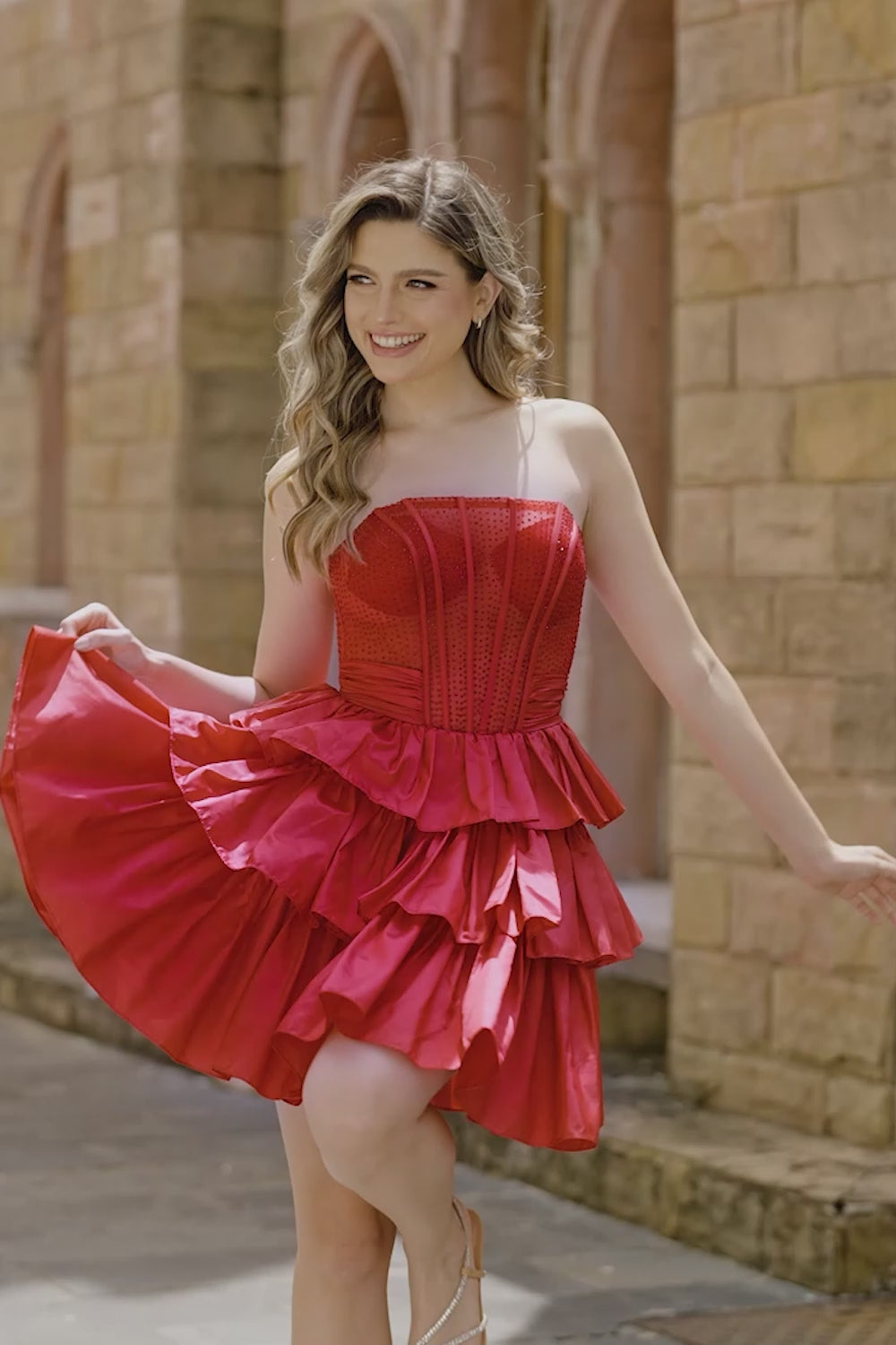 Red Strapless A-line Tiered Corset Beaded Short Graduation Dress with Bow