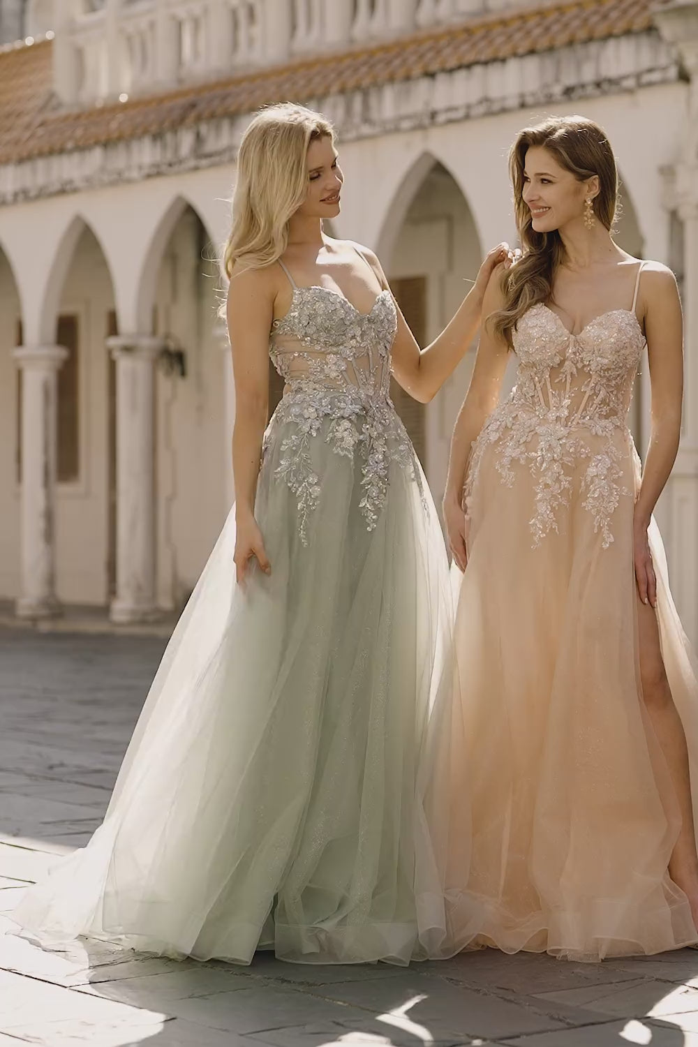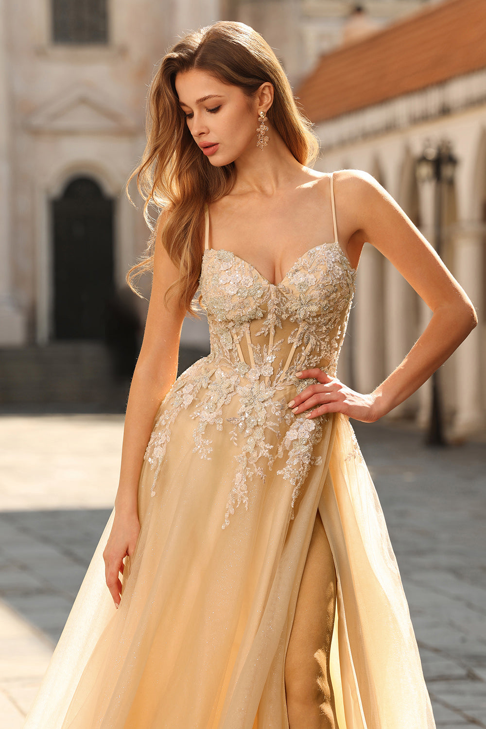 Sparkly A-Line Beaded Corset Peach Sequin Long Tulle Prom Dress with Slit