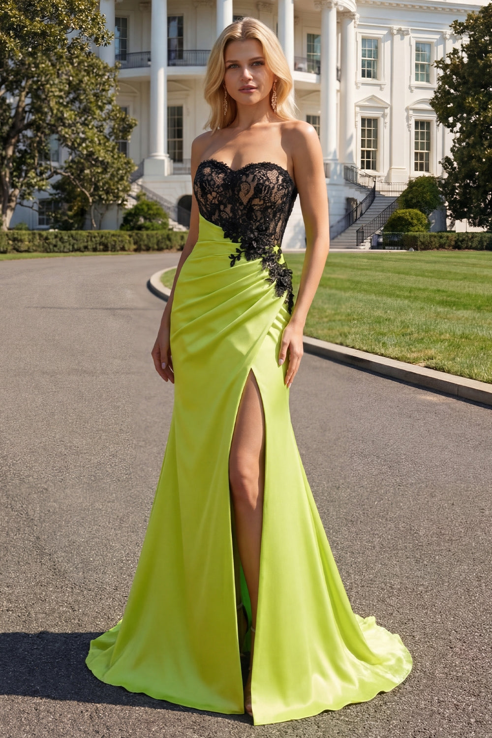 Strapless Mermaid Green Appliqued Lace Long Prom Dress with Slit