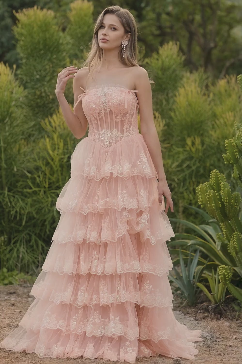 Strapless Tiered Ruffle A Line Blush Corset Sequin Long Prom Dress with Slit