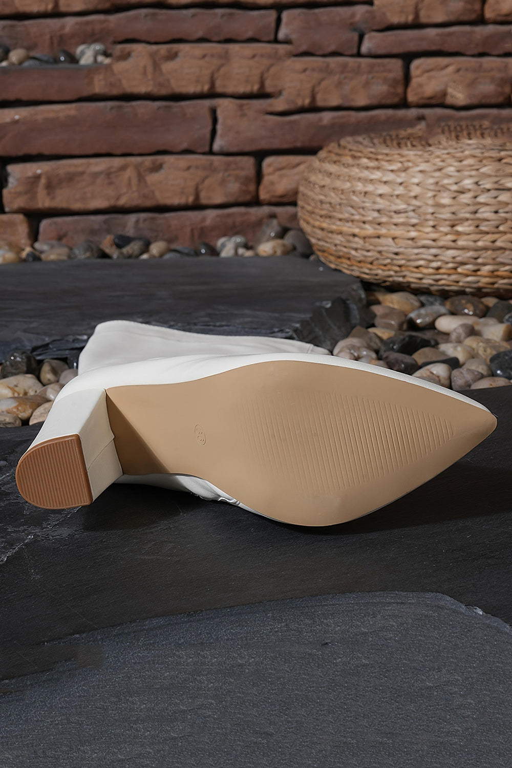 White Wide Calf Pointed Toe Knee High Chunky Heel Boots