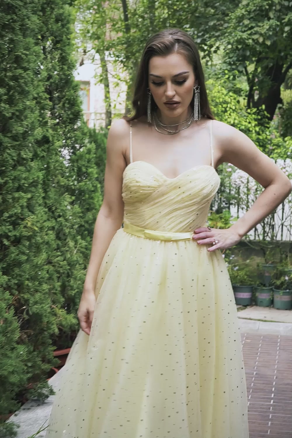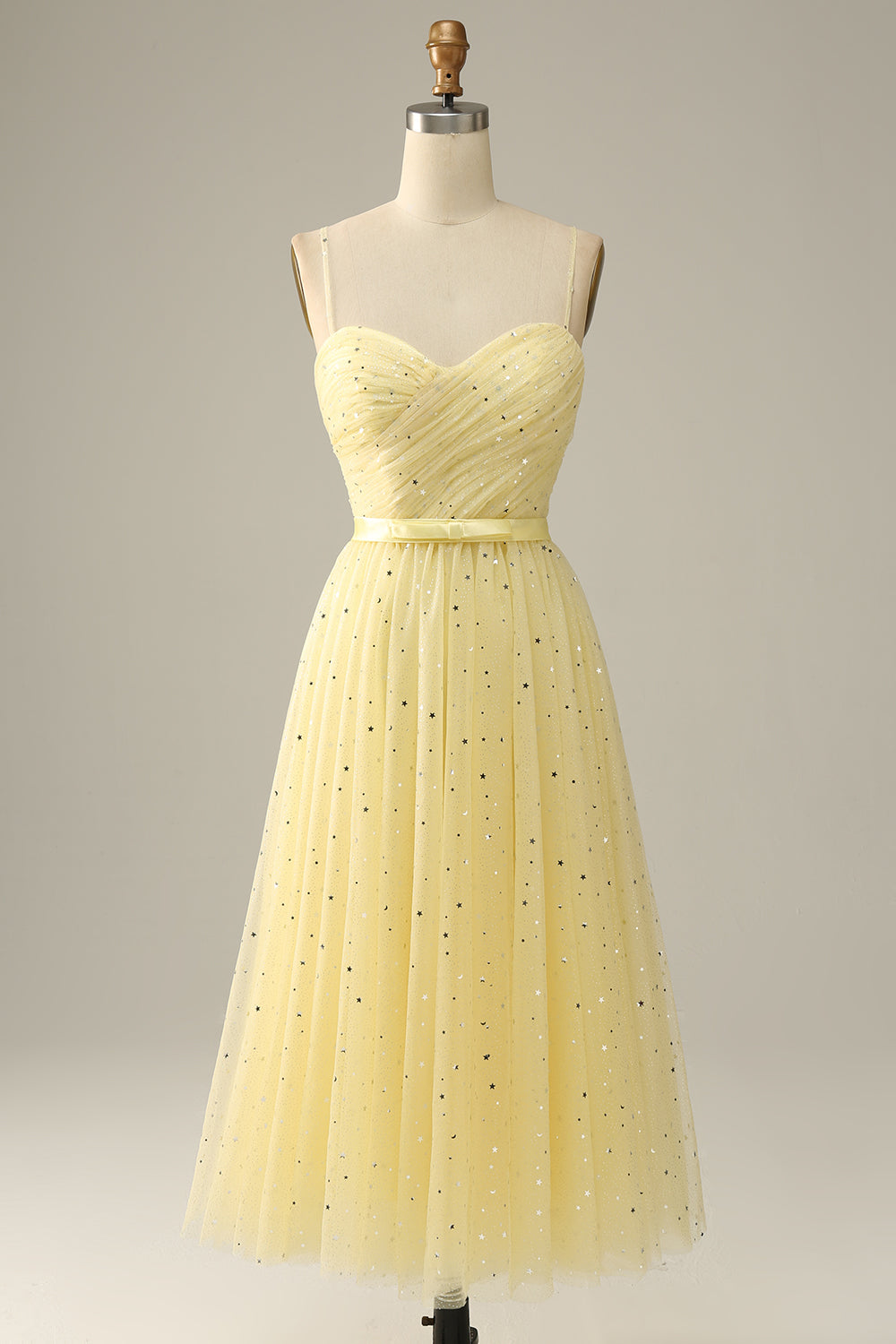Yellow Spaghetti Straps Tea Length Prom Dress